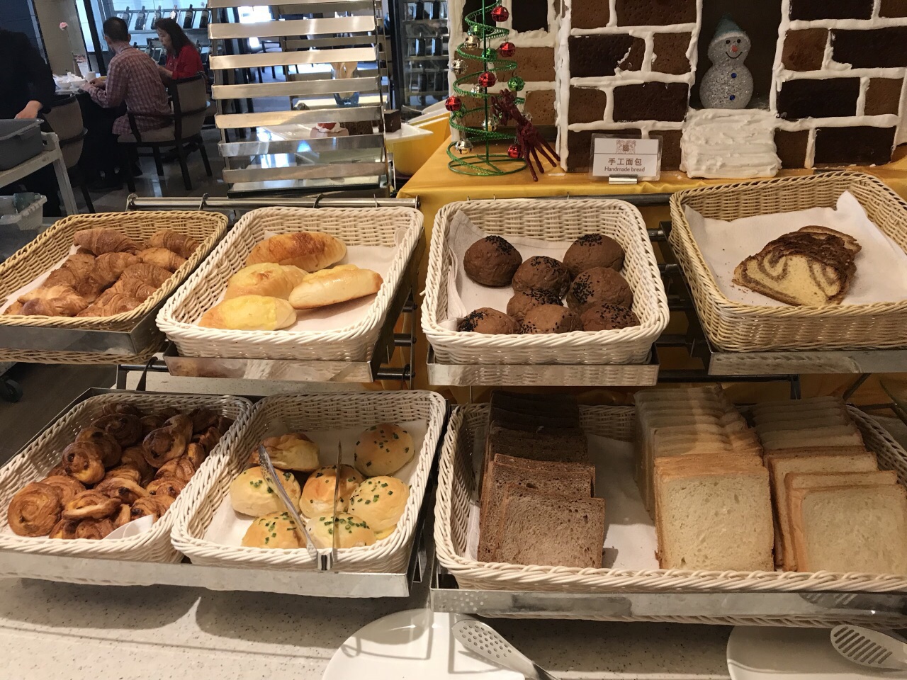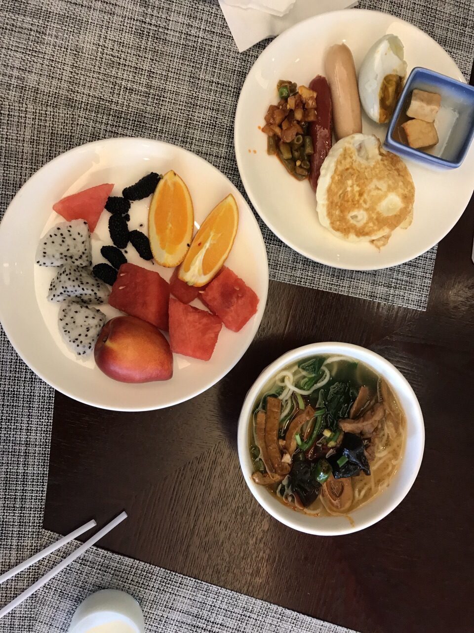 ...的小面包蛋糕品质一般 ✨酸奶、水果、豆腐脑、鸡蛋饼、饭团、粥,咖啡,三种卤的面条,这些都很好吃