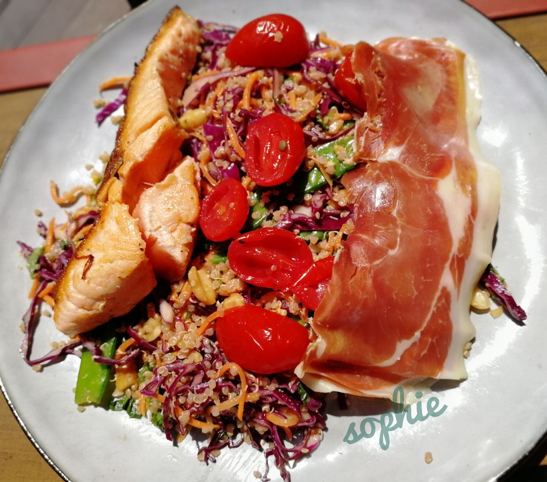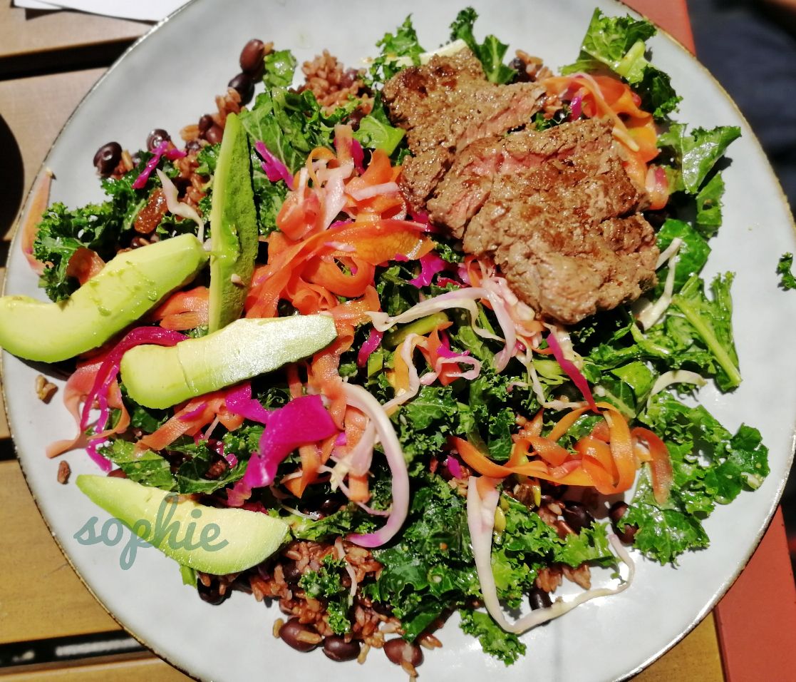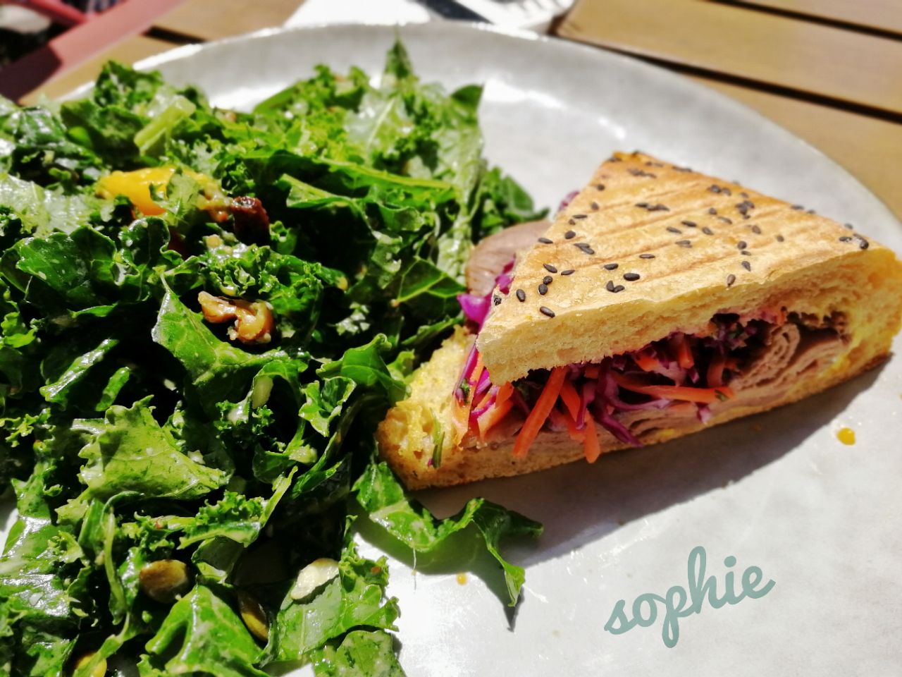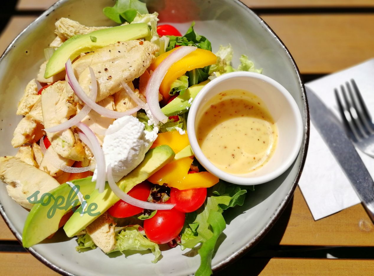 有人非要在29℃的大晴天坐在外面晒太阳,无奈这里室外的座位都没有遮阳伞,我们就这样在烈日暴晒下吃了一个小时,简直晒得要烧起来了。。。这里的简餐品种还是蛮丰富的,还可以添加额外的食材,特别很适合啃草族们。很久没有吃色拉,于是点了份鸡肉芒果牛油果色拉。食物是挺新鲜的感觉,吃起来自己觉得很健康。上来好大一碗,最后我竟然还吃得很干净哈哈~