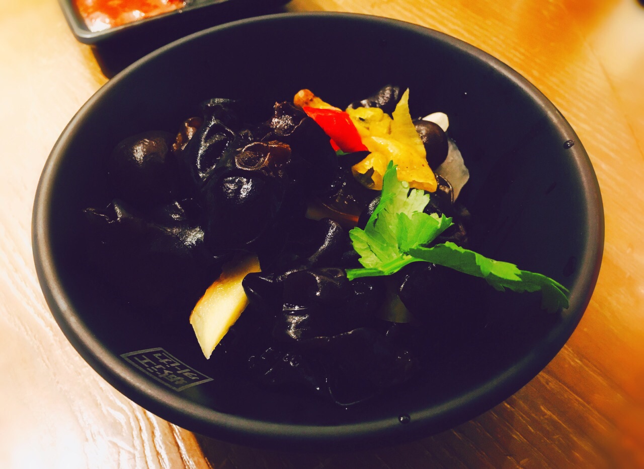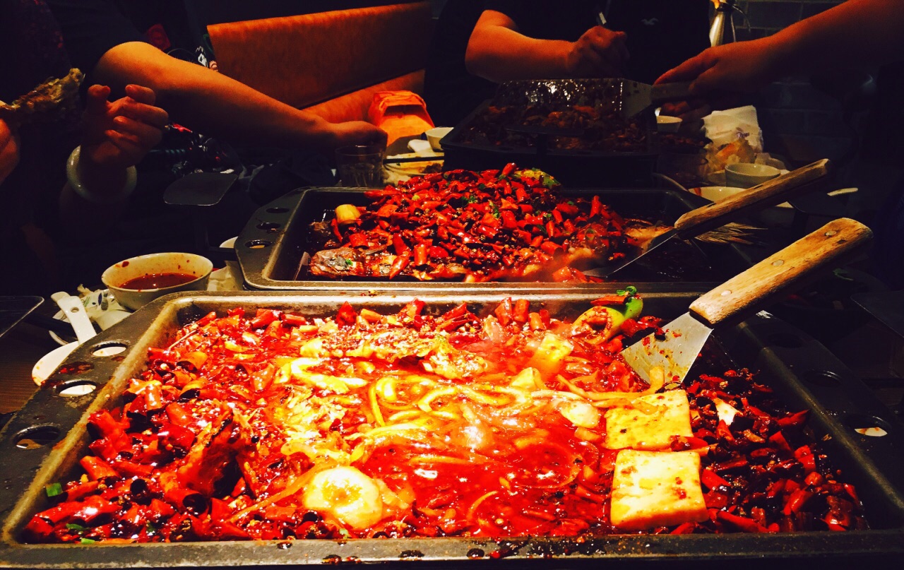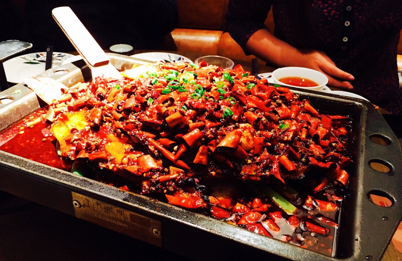江边城外没什么大位置,我们9个人去,才给我们一张小桌子,还好去的早,空桌子多,两张桌子拼下才勉强坐下。 点了怪味的江团和麻辣味的清江鱼,明显怪味的比较好吃,配菜比较推荐魔芋丝,比较吸味道,腐竹莴笋也不错,可惜没我爱吃的金针菇。鱼都不大,我们一共吃了5条。桃花酿味道不错,甜甜的桃子味果酱,不涩口,口感像米酒。 价格还行,人均110。
