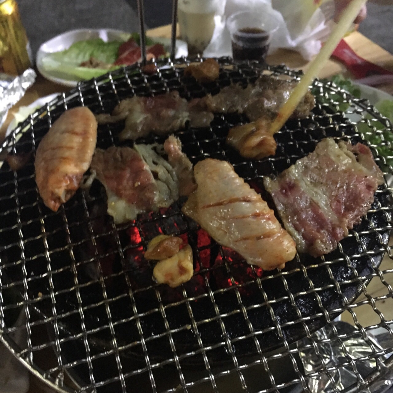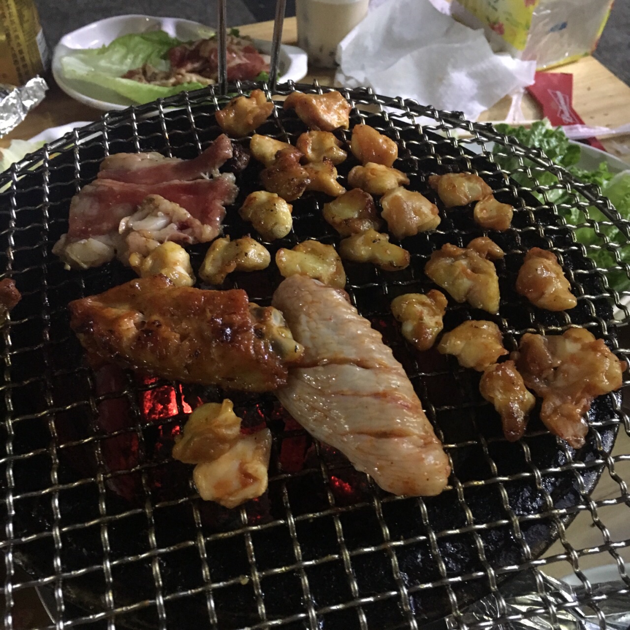 周末正好下雨天过来吃,外面桌子因为雨太大只能开几桌。 我们四个男生点了一份四人餐吃饱了(虽然其中一个人是吃了饭过来的) 口味:和网友们评价一样,都是腌好的肉,所以烤完之后够味,但我个人比较重口,还是喜欢蘸料碟。 份量很良心,希望商家继续保持下去。 环境:就是大排档环境,我还是比较喜欢这种氛围的。 服务:服务就很一般了,虽然知道因为人多忙不过来了,但是至少应该和客人说一声比较忙,点的东西都会一个个上的,这样客人心里会安心点。卤花生当天没有了也没有说一声,最后只说是送的,今天没有做。但是包含在套餐内的东西所有都可以说是送的,有就是有,没有就是没有,这个是原则问题。 店里阿姨也很让人不舒服,好生说话也不回答问题,说拿个塑料袋装雨伞也说没有......
