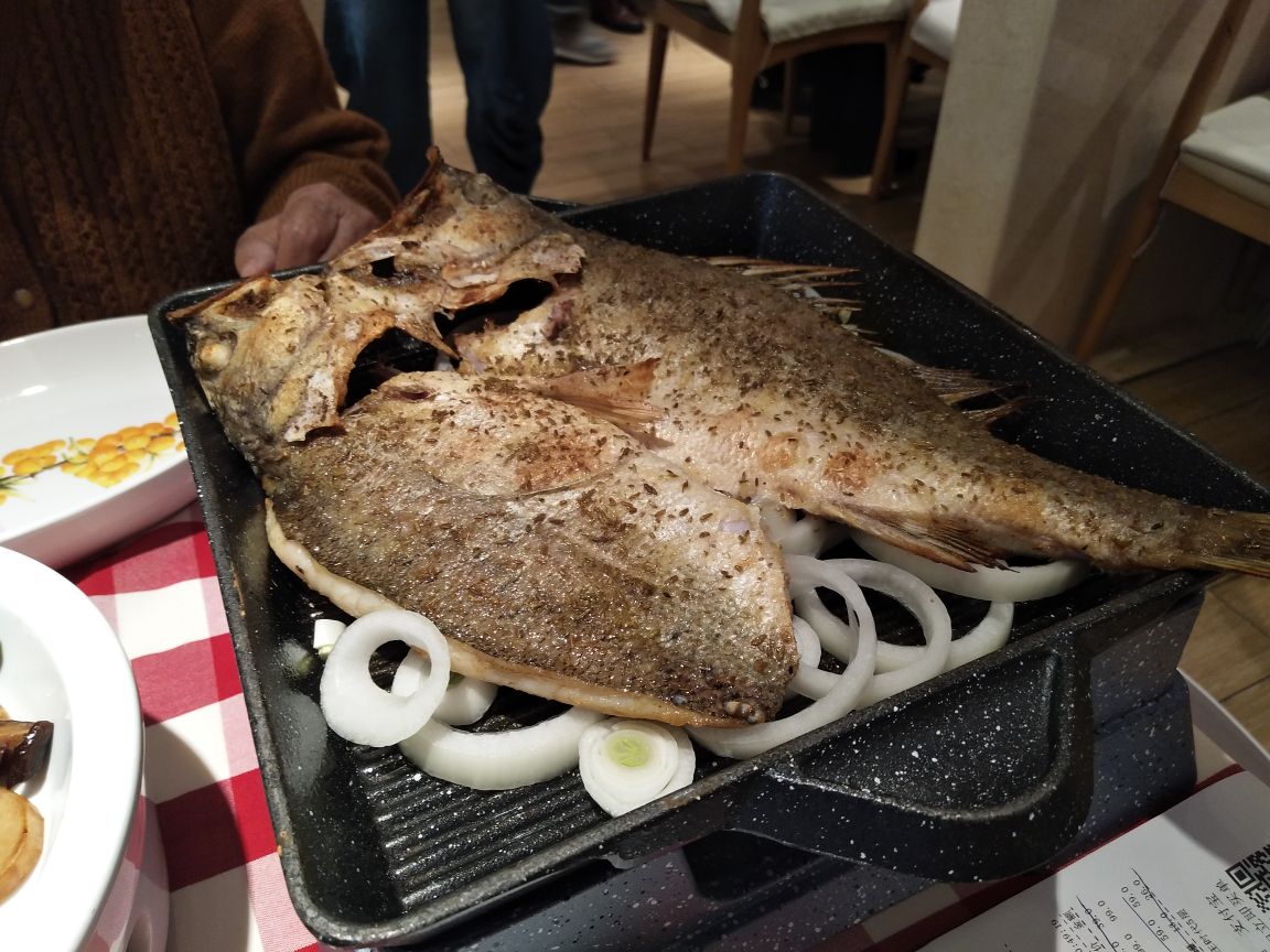 点了一份葱香烤鱼,鱼是海鲈鱼,属于烧烤口味,因为带着老人所以选择的免辣,鱼很新鲜,鱼身下垫的是洋葱,也不是太咸,感觉味道不错。点了一份橄榄油炒蘑菇,油稍微有点大,多吃几口会有点腻。黄米凉糕很好吃,酸奶还是一如既往的好。