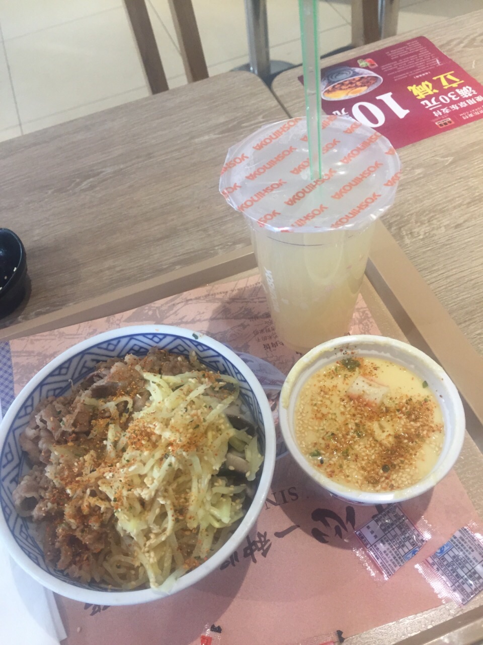 这家吉野家开了很久很久了,其间也装修了几次吧?!来这儿吃饭,有着满满的回忆,以前孩子在附近上小学,常常来此吃饭,如今孩子大学都毕业了,这家餐厅还在!点了一份会员特惠的套餐,餐台旁边还配有自助的调料台供人自选,桃汁饮料很好喝,菌菇牛肉粉,中规中矩吧!