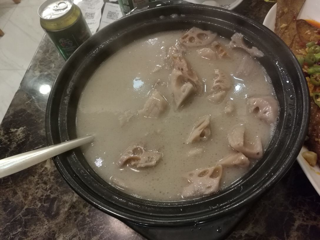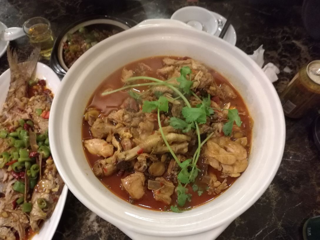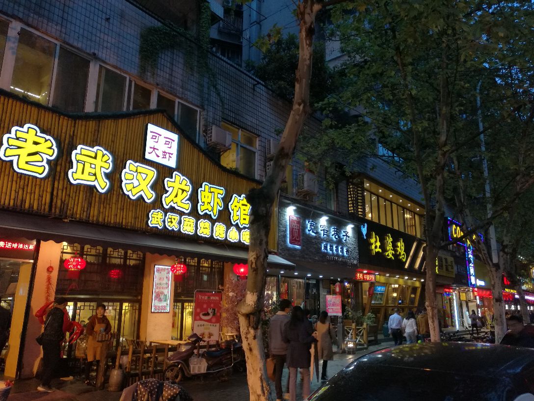 万松园店的杜婆鸡,相比于其他食店在晚饭时间尚算不用等位。同一时间路口两间巴厘龙虾已经要等位叫号了。杜婆鸡是湖北名菜,用十几种香料药材炆制而成。一百多元一煲三个人是绝对吃不完的。我吃了一只大腿,两三件鸡胸肉,满口麻辣了,尝不出鸡肉鲜味。排骨藕汤也是特产,料足,味浓,好喝。武昌鱼是扁鱼,小骨较多。肥肠重口味,偏咸。有二楼,可一览众食店。
