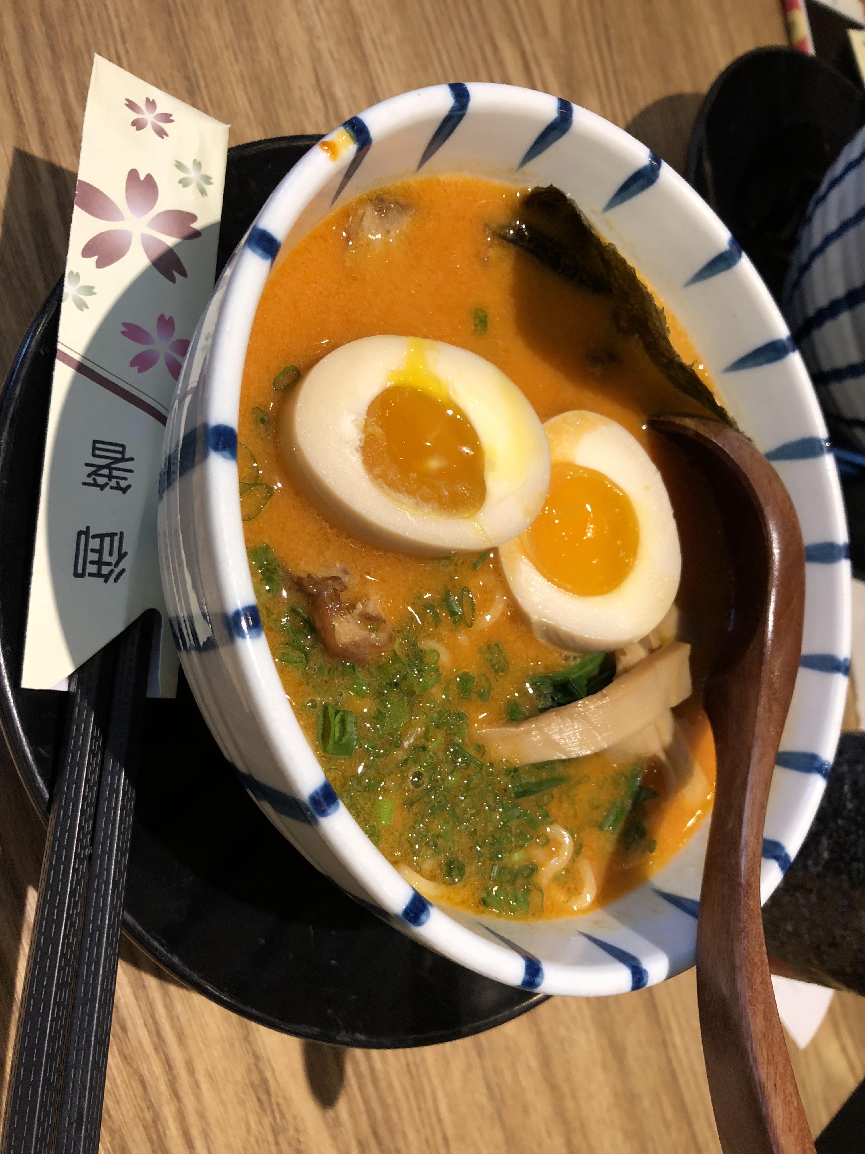 老婆公司附近的拉面馆,中午来找老婆午餐,评分挺高的,于是就选择了这家。 这家拉面馆的生意不错的,午餐时间,附近的上班族都来这里用餐。 所以环境有点拥挤,经常会没有座位,而且服务跟不上,基本上工作人员都挺忙碌的。 食物的味道还不错的,拉面很劲道,汤底也很好喝,基本光盘的节奏。 拉面的份量不是很大,这点有点小遗憾的。