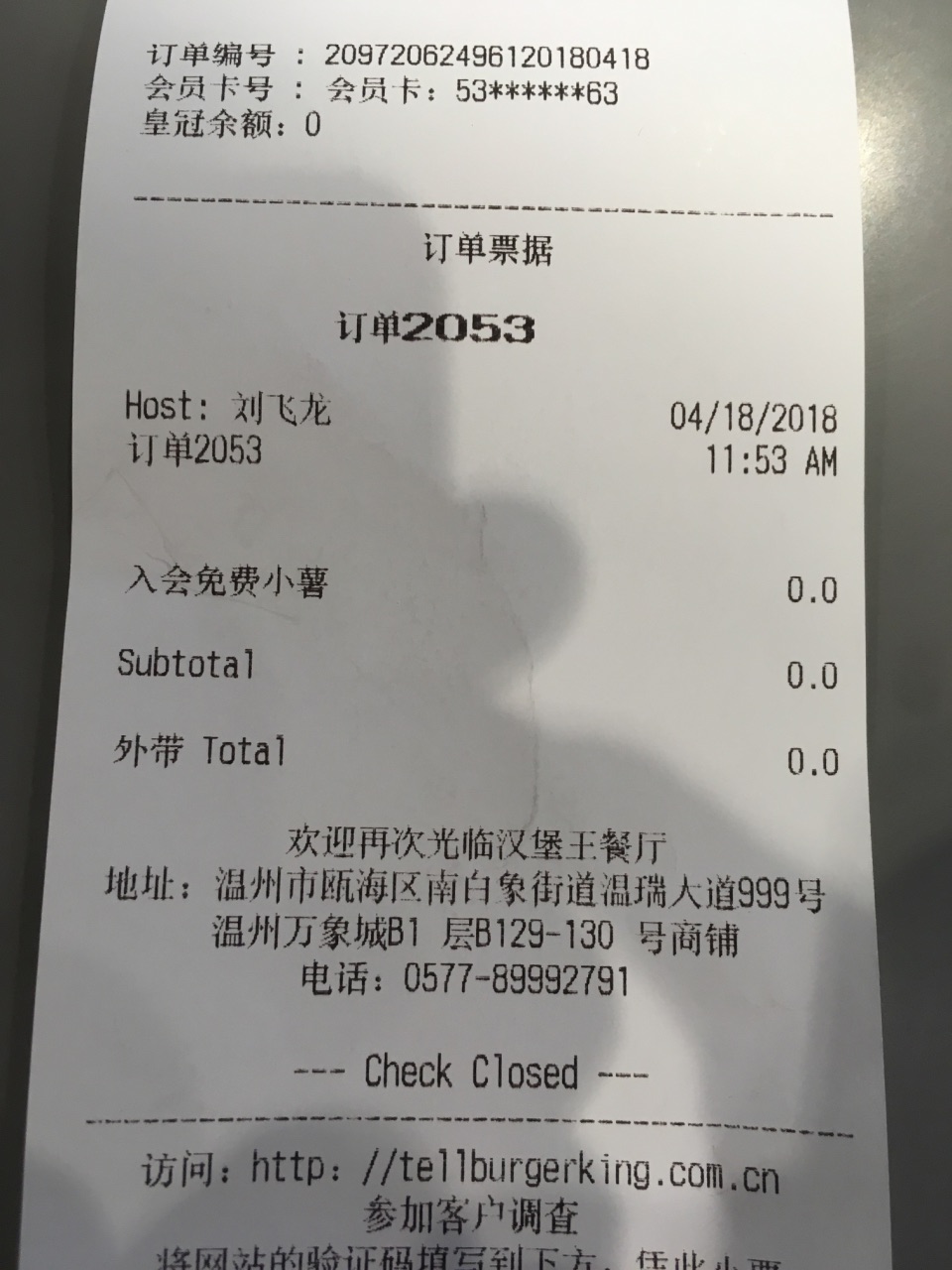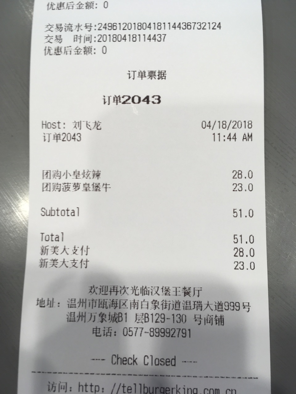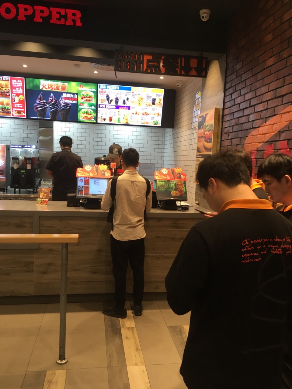 这次来万象城,就收特地为了汉堡王而来的,这是温州第一家汉堡王,店位于南白象街道温瑞大道999号温州万象城B1层B129-130号商铺,外观很醒目,装修的比较工业风,店里生意特别好,我等了好久才等到我点单,我团购了炫辣鸡腿堡,小皇堡,鸡腿,还有火烤菠萝皇堡;味道是真的不错,牛肉紧实,鸡腿堡的味道也还可以,辣度正好;鸡腿很入味,口感很赞,而且我注册了汉堡王新会员,他们又额外送了我一份小薯条。总体真的很棒!