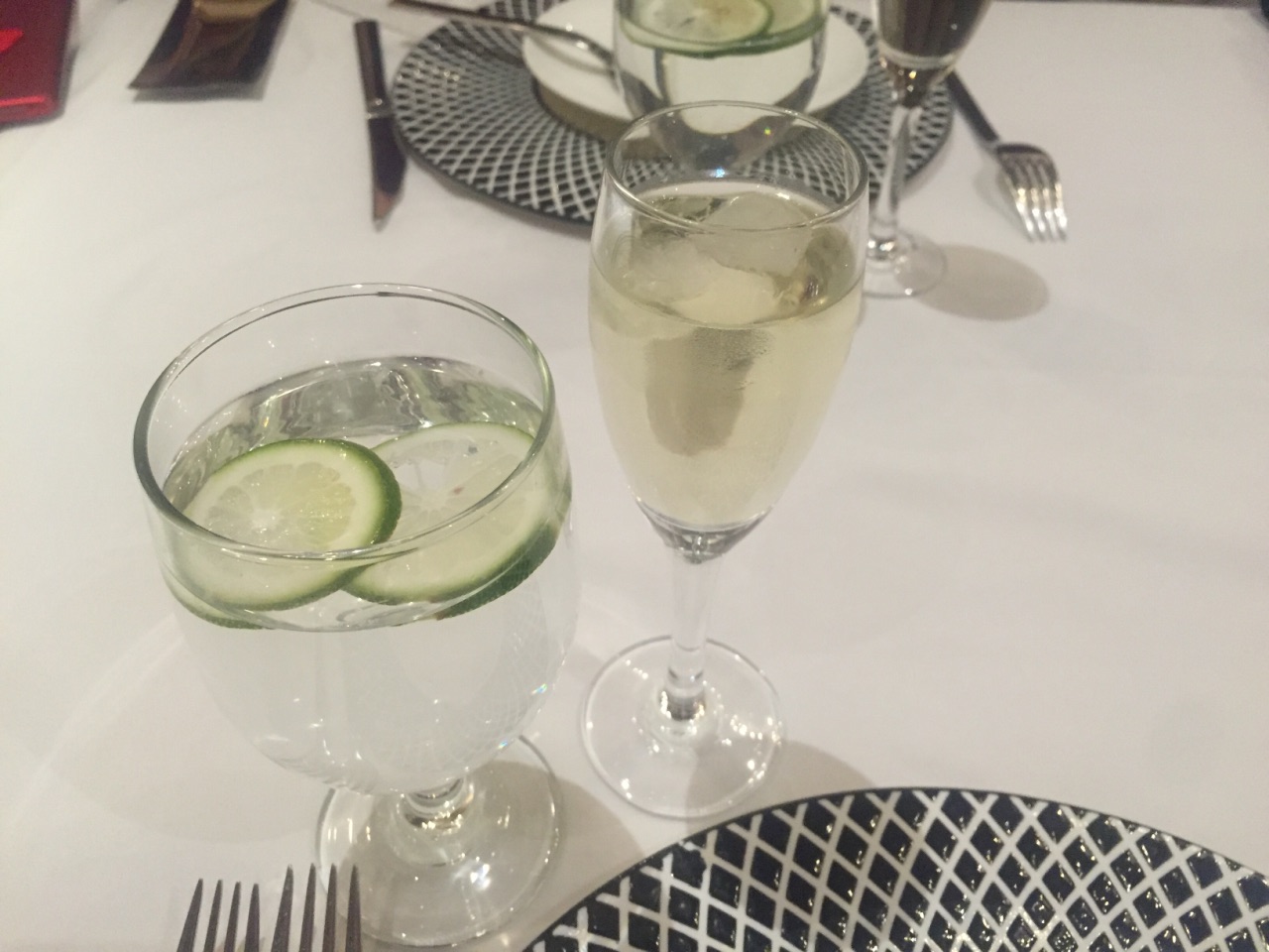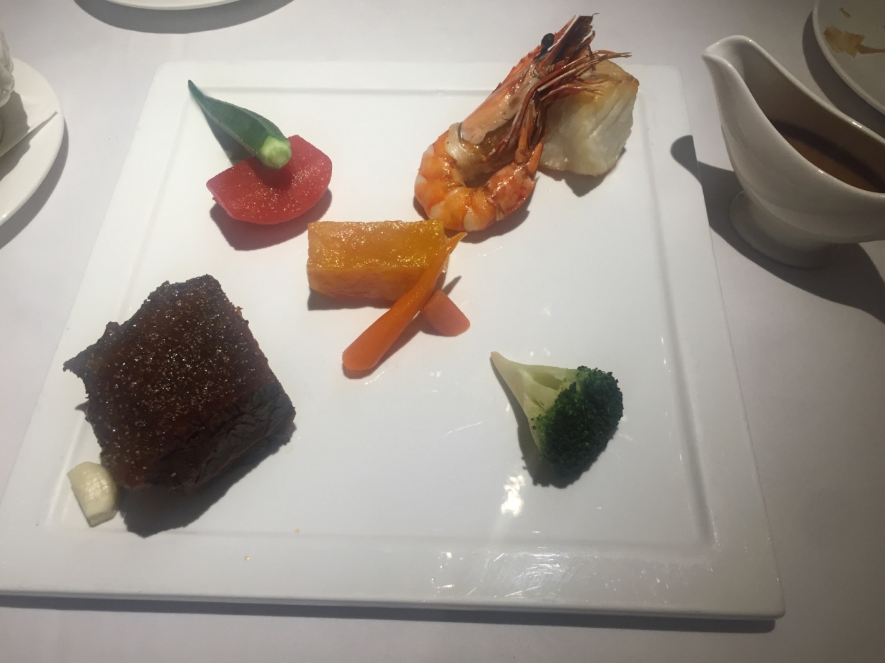 海陆大餐,摆盘很好看,台塑牛排很厚实,肉质鲜嫩,大虾和鳕鱼块很香。餐前酒甜甜的,很好喝