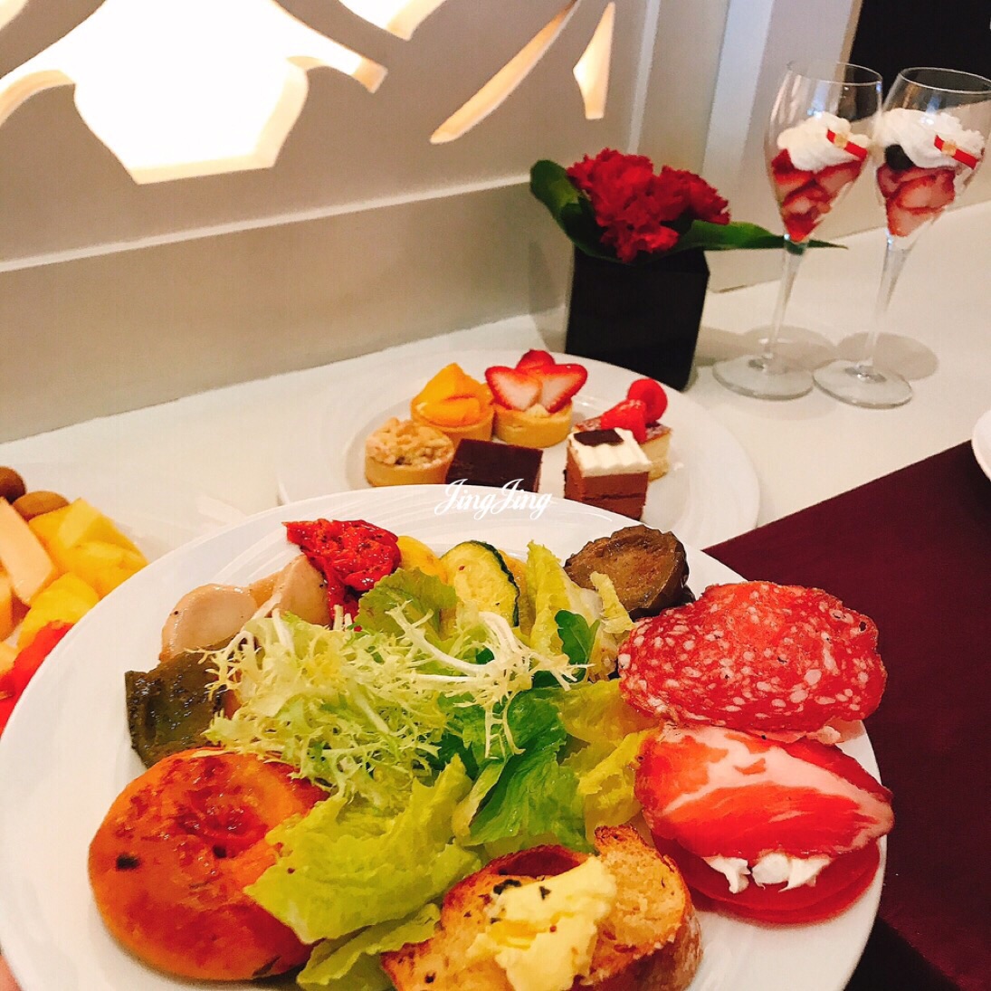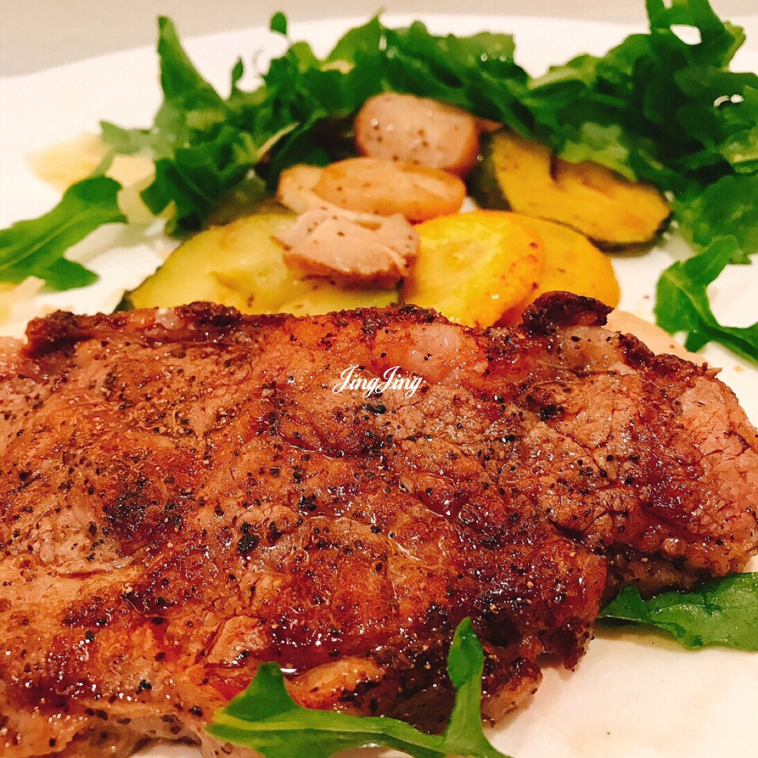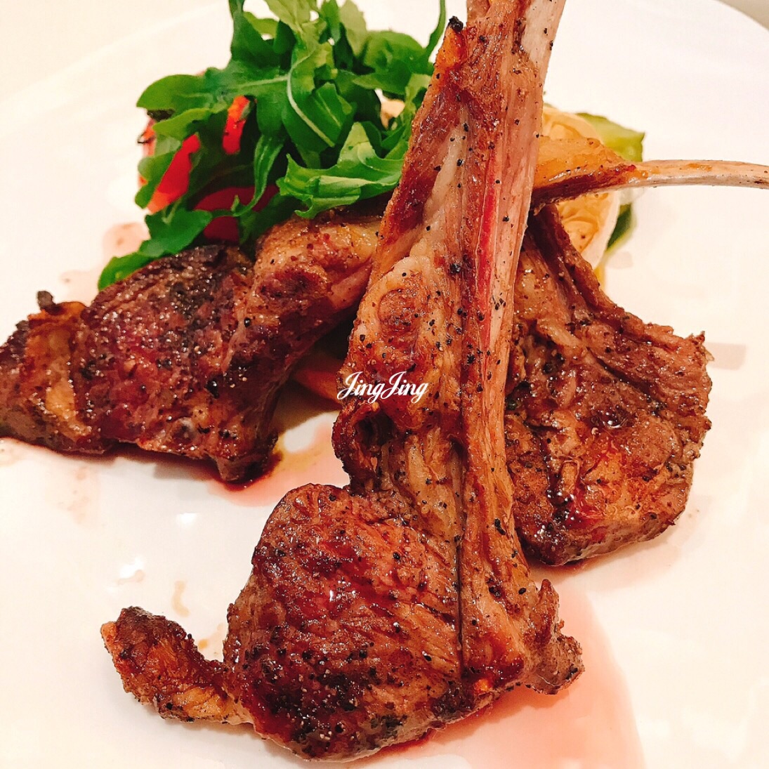 ☞ 烤蒙古羊排: 三块蒙古羊胺排,配芝麻菜➕烤番茄,有机圆番茄,个头塞过乒乓球,水分足,搭配羊排吃解腻又清爽; ☞ 烤美国西冷牛排 不愧是JW加州扒房的出品,要了五分熟,肉质不错,没有筋筋拉拉,鲜嫩多汁,入口刚刚好。烤杏鲍菇、黄瓜、西葫芦切片做配菜,撒上的帕尔马干酪增添了香脆奶酪口感;
