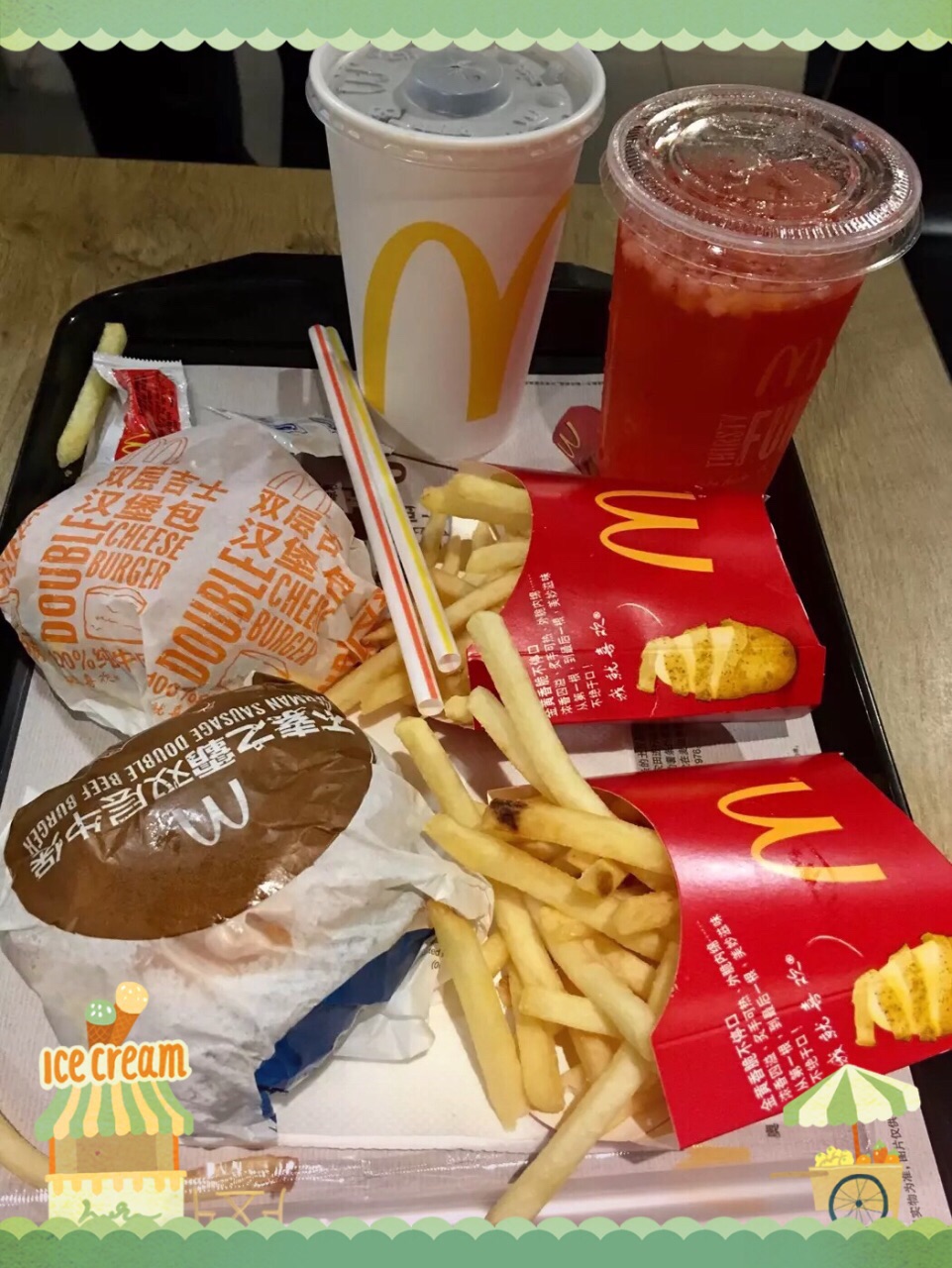 开了好多好多年啦,2001年读初中的时候就在这附近,这家麦当当就开了好久了的说。 真的好久没来这家了,大概10多年了吧,还是原来的感觉,喜欢地下的感觉,回到青春期~ 好久没吃快餐了,觉得味道还不错耶~两个set55块钱,还是蛮划算的。就是wifi上不去。