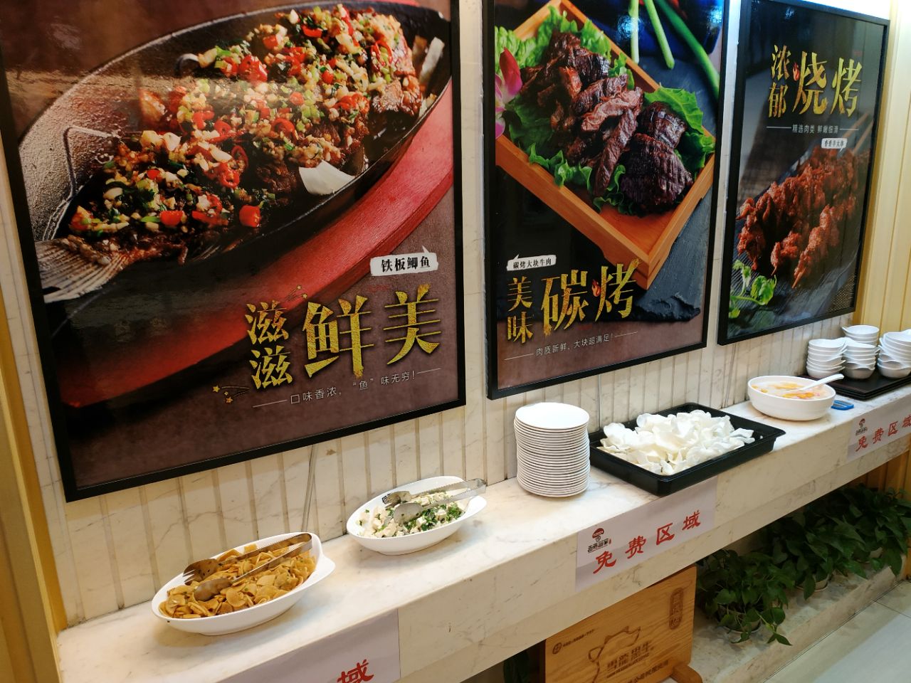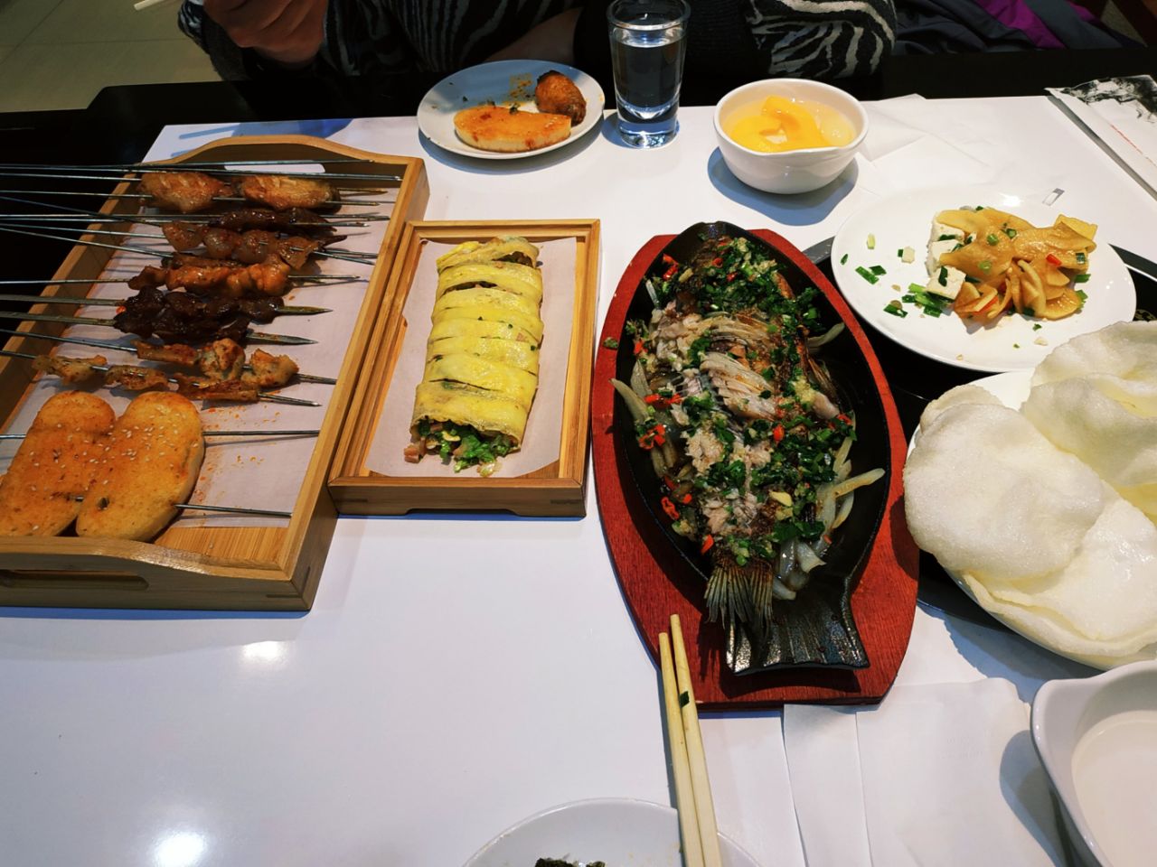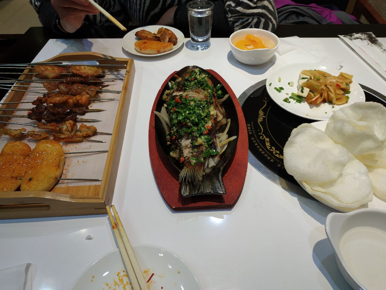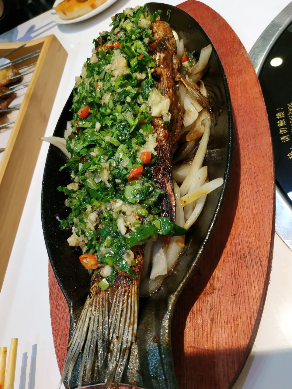 以前的何仙姑火锅松江路店改造成火锅和烧烤店了。刚开业抢购的39元抵100元的券,很便宜哦 晚上五点半整个店里就老妈自己在等我,还没有客人,感觉这个地理位置确实不怎么吸引客人。晚上六点半后陆续有客人来。 推荐的菜品 烤鲫鱼 鲫鱼烤得外酥里嫩,鱼皮上有一层厚厚的蒜头和香菜的末,很好吃提味,而且爱吃铁板上铺的那一层圆葱,解腻。 烧烤整体味道中规中矩,烤串味道不错,推荐他家的免费小菜,萝卜片脆脆的酸甜可口,陪着烧烤很清口。