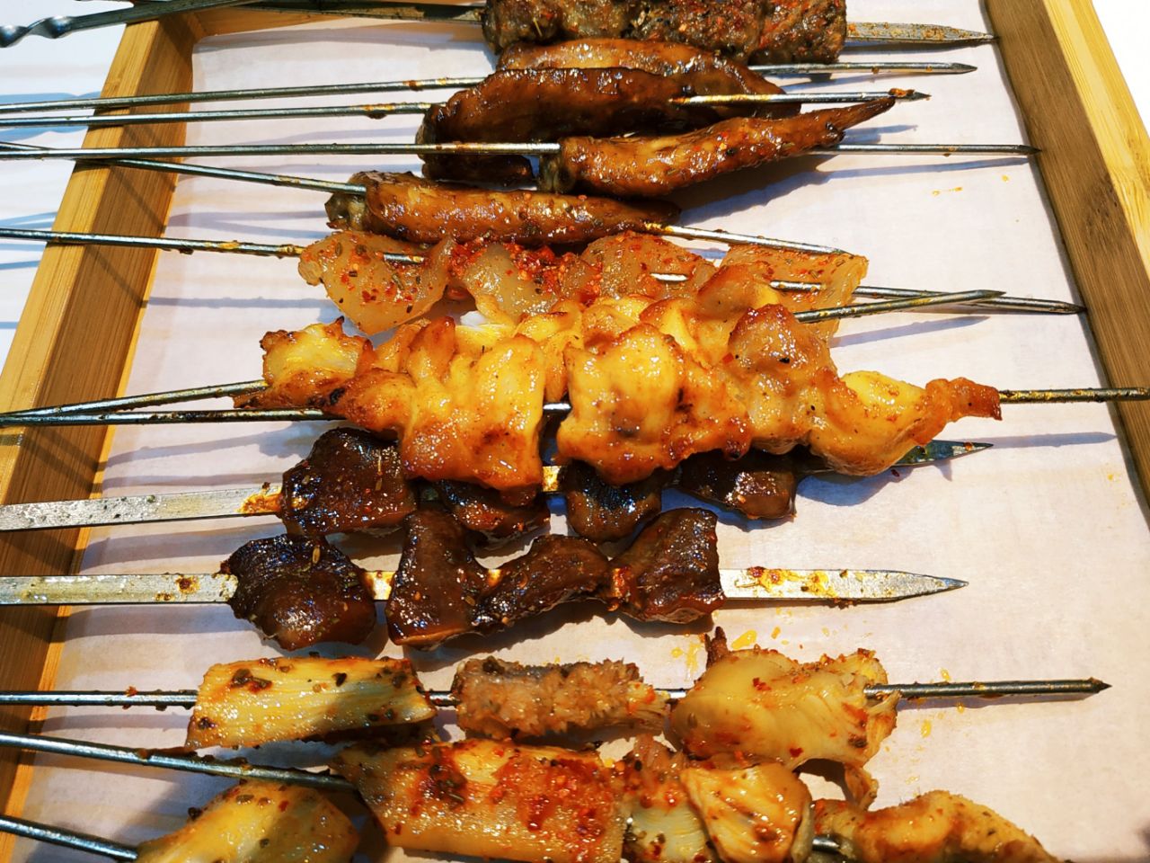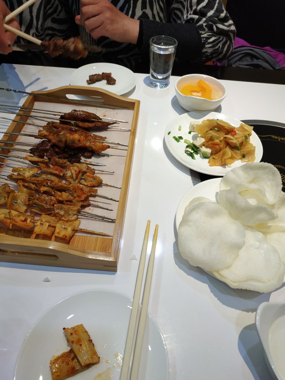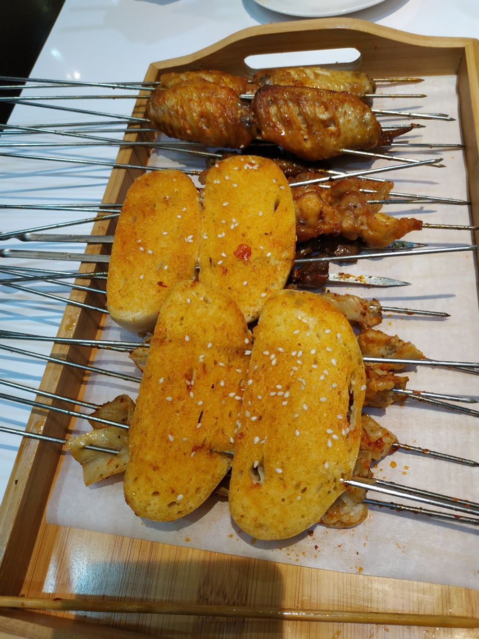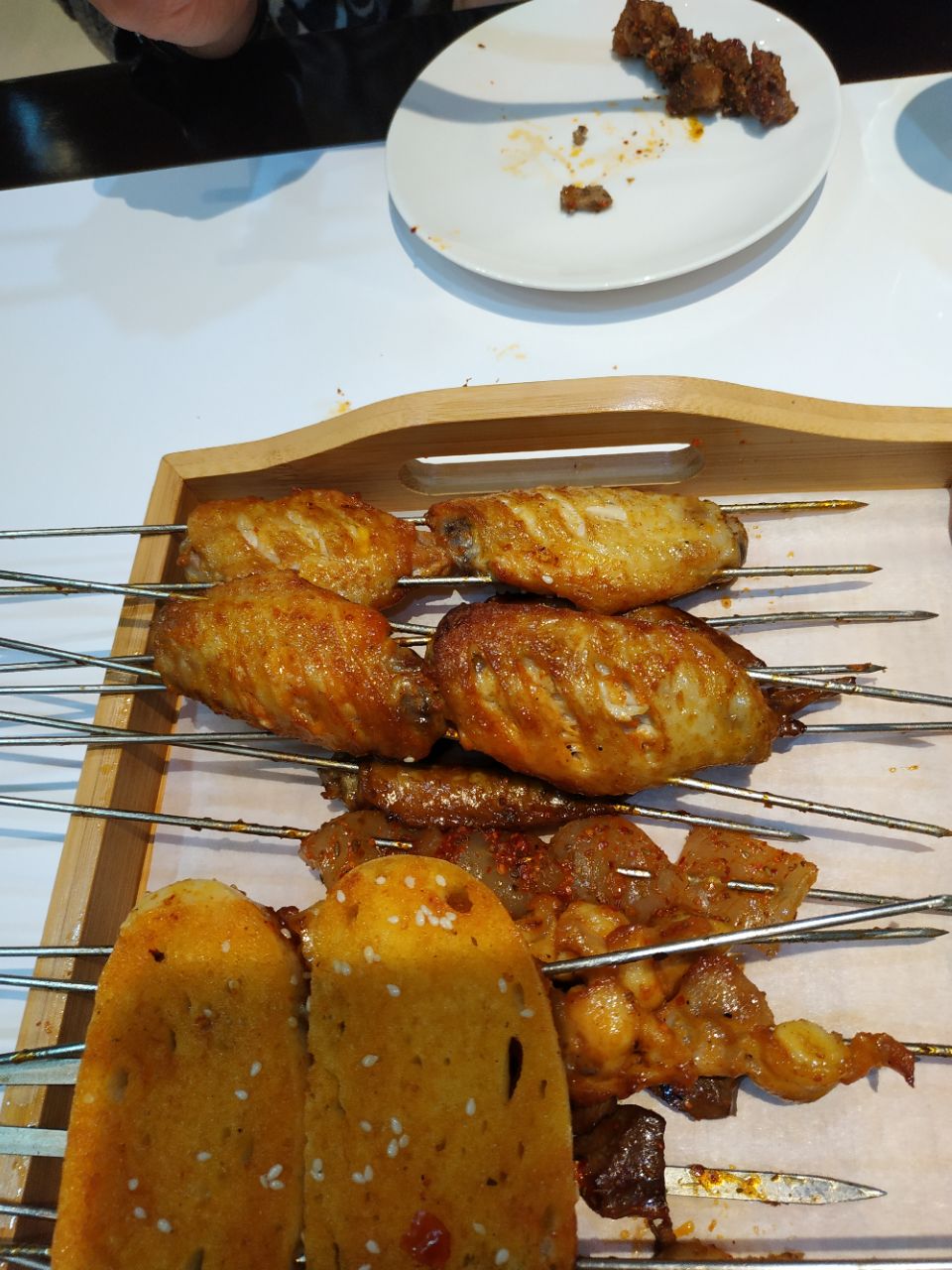 以前的何仙姑火锅松江路店改造成火锅和烧烤店了。刚开业抢购的39元抵100元的券,很便宜哦 晚上五点半整个店里就老妈自己在等我,还没有客人,感觉这个地理位置确实不怎么吸引客人。晚上六点半后陆续有客人来。 推荐的菜品 烤鲫鱼 鲫鱼烤得外酥里嫩,鱼皮上有一层厚厚的蒜头和香菜的末,很好吃提味,而且爱吃铁板上铺的那一层圆葱,解腻。 烧烤整体味道中规中矩,烤串味道不错,推荐他家的免费小菜,萝卜片脆脆的酸甜可口,陪着烧烤很清口。