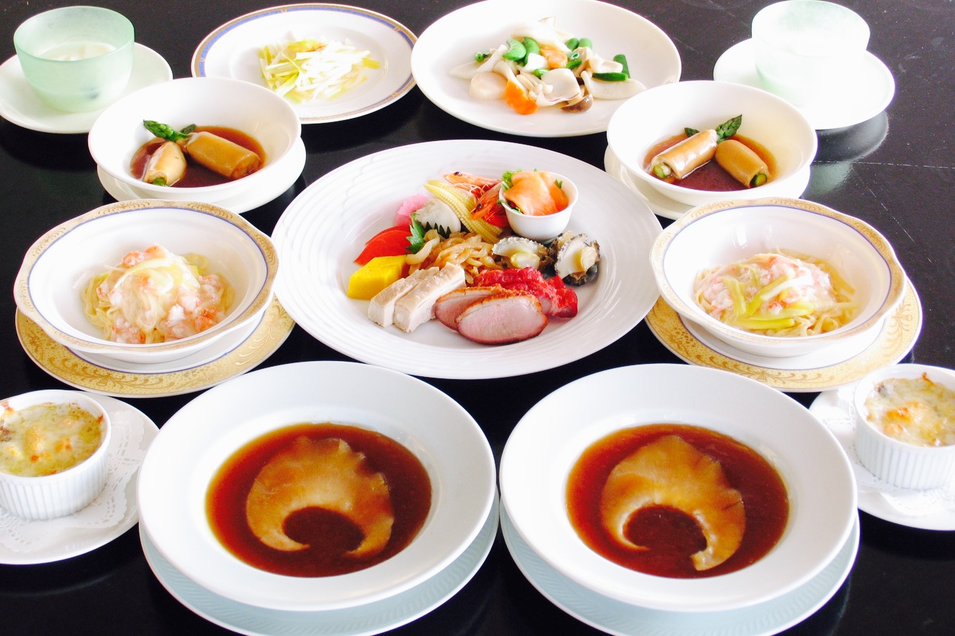 前菜,蜂蜜叉烧,葱蒸鸡,水母已经提前预约好了,我们比预定的时间稍微早一点就到达了餐厅,尽管当天在下雨,但中华街的人气还是很高,特别是这里人真的超级多,不过这里的食物味道非常美味,服务也很周到,推荐大家来试一试。