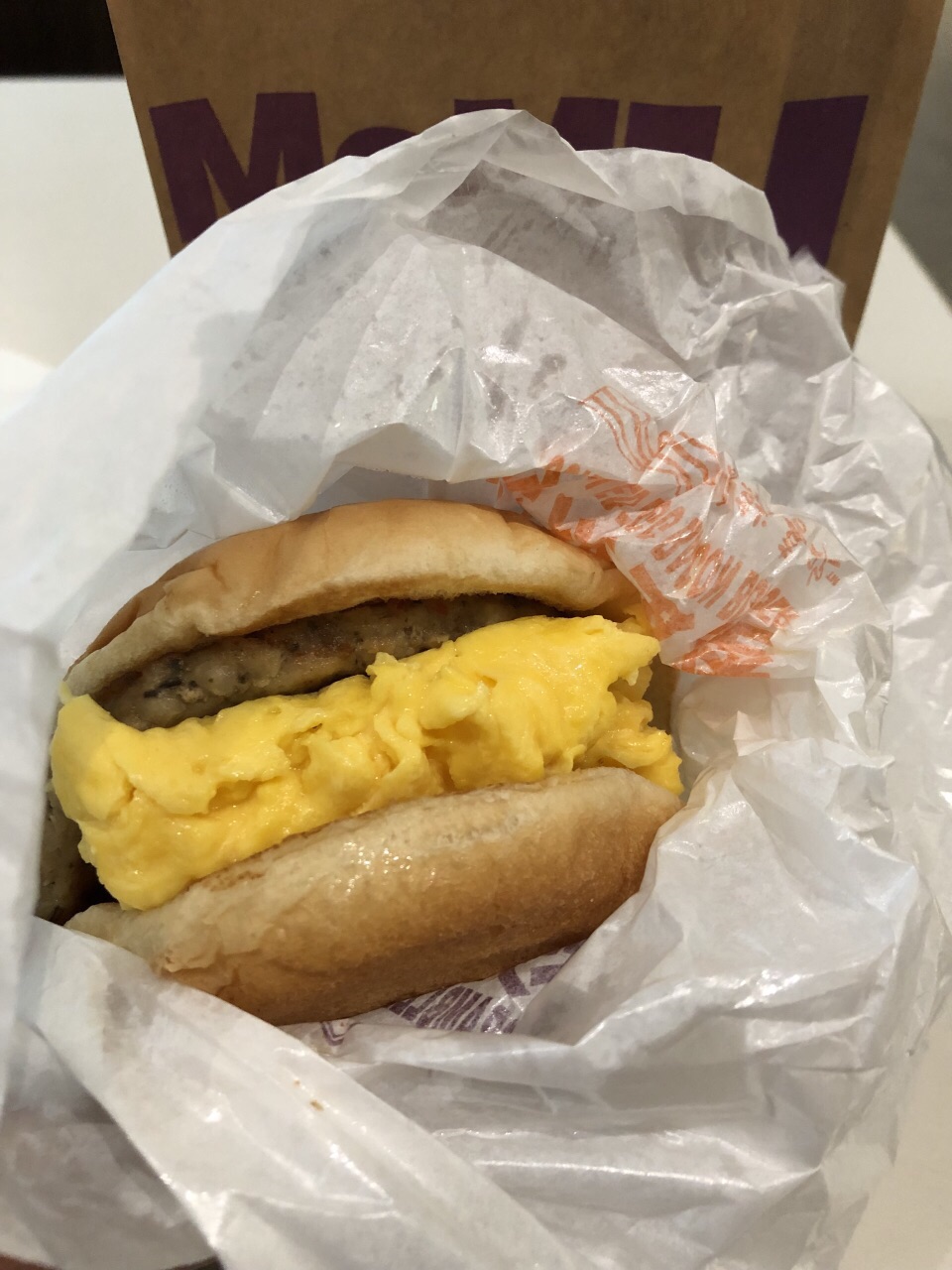 | 麦当劳 高铁站出发夹层,看到麦当劳。想起早餐新出的猪柳炒双蛋堡,前来试试。早班高铁的时间,店内人不是很多,环境很大,不吵杂。点单取餐都很快。猪柳没有什么特别,炒蛋很嫩,我很喜欢。营养均衡,搭配豆浆还是不错的早餐选择。