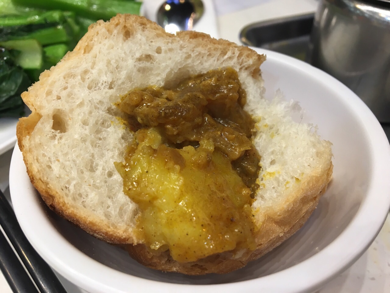 尖沙咀有一条澳门街,其实指的就是乐道,只因为在短短的乐道上面就有五家澳门茶餐厅,一字排开的店面。随便走进哪一家,菜单其实都是一样的。在这种情况下,都还是常常没有座位,需要与人拼桌。葡式蛋挞还是留着去澳门的时候吃玛迦烈的好了,就先来尝一下澳门的猪仔包。再点了一个咖喱牛腩,搭猪仔包。话说咖喱真的好辣,还好有猪仔包可以稍为综合一下这个辣度。感觉澳门菜的味道比港式茶餐厅的味道更重一些。