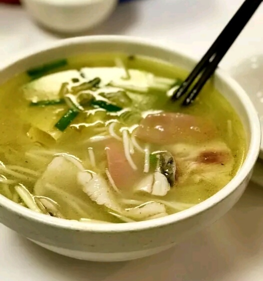 店内装修简约质朴,服务态度周到热情,点了招牌过桥米线和火爆腰花,不多会儿就上菜了,还是记忆中熟悉的小时候的味道,厨师水准真不错,米线爽口里面配的腰片嫩香鸡片美味,汤鲜营养,火爆腰花份量很足,腰花嫩爽不腥,恰到好处的美味。