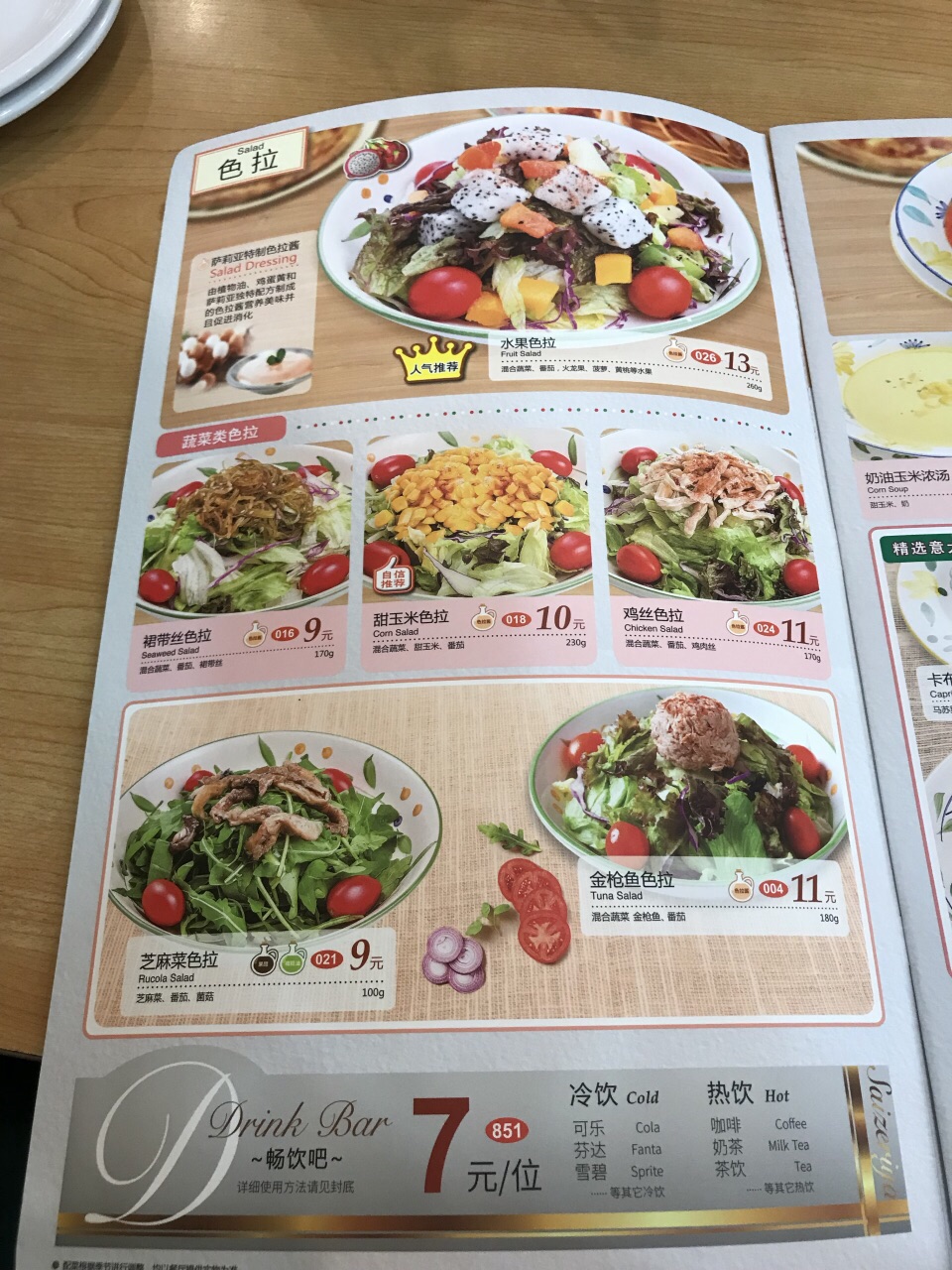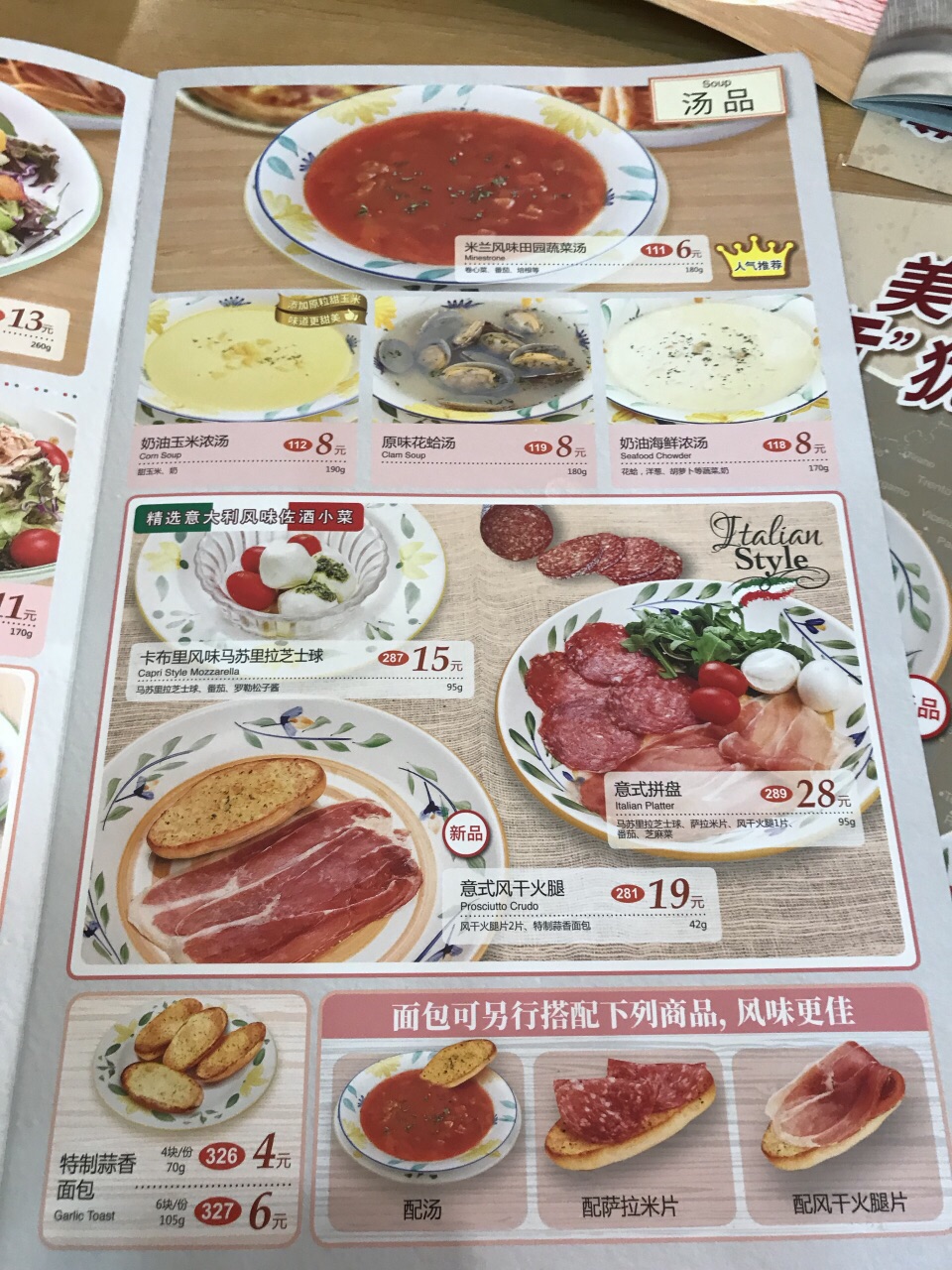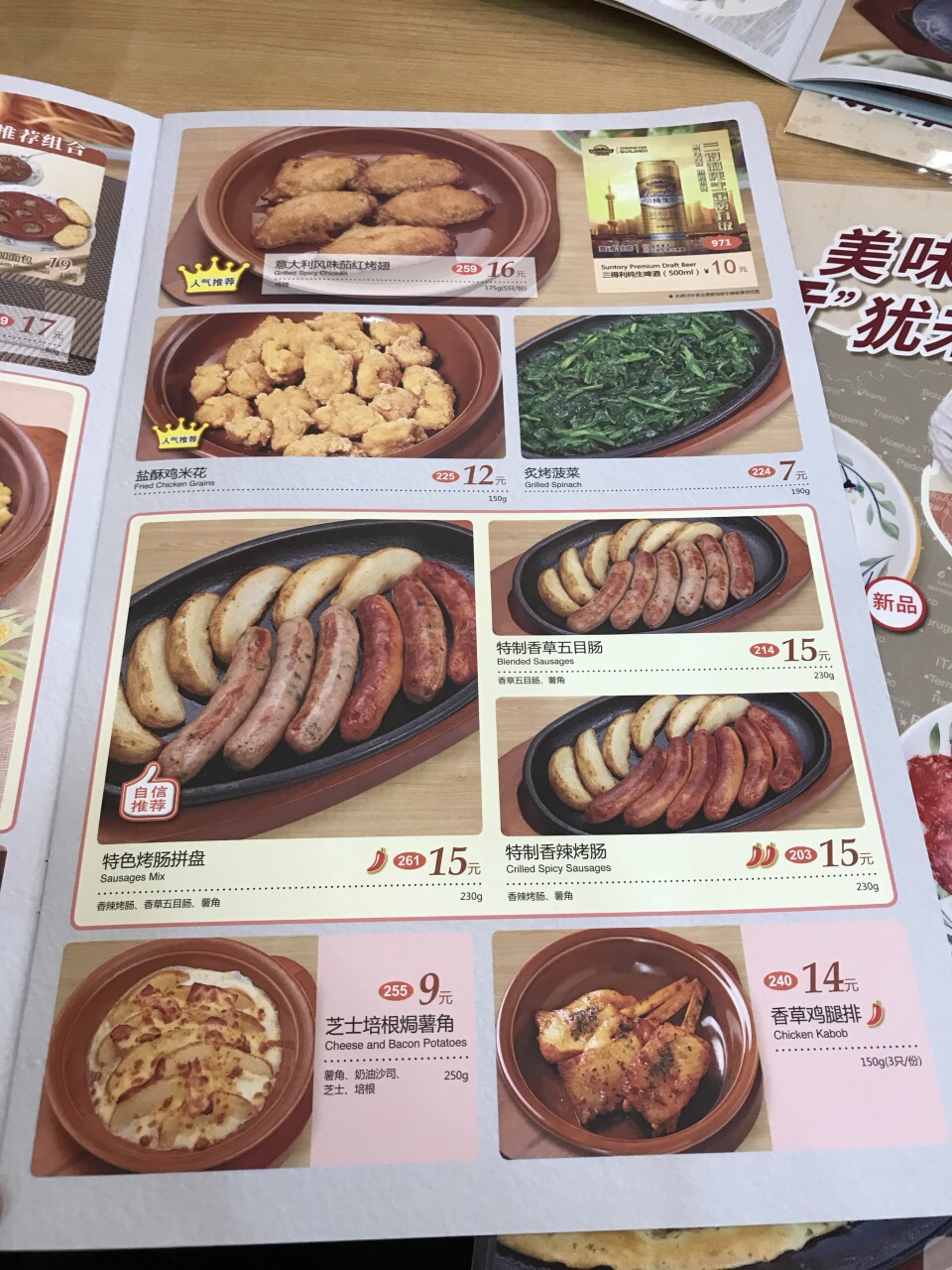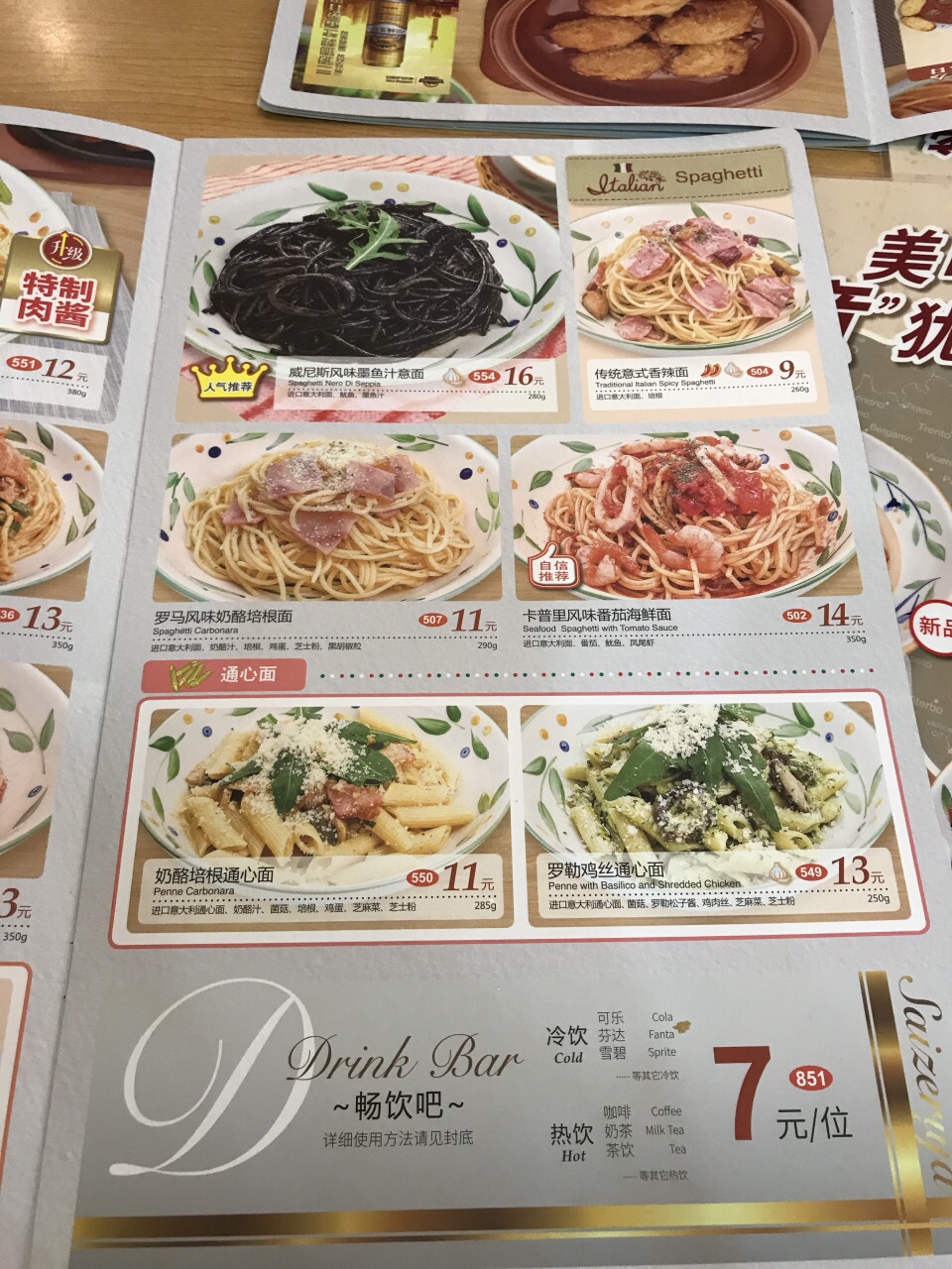 下午逛累了来到这里,还是第一次到环亚凯瑟琳广场。无意中看到萨莉亚,真是便宜到无可挑剔了…… 烤肠拼盘不错的,两种香肠,一种挺辣的,一种香菜味的,还配有烤土豆。 推荐的黑椒培根意面,感觉没有罗勒松子酱意面的好吃,可能个人口味不同。 匹萨:我选的是金枪鱼蛋黄酱口味,真心做的不错,饼底酥脆,上面芝士香浓糯,很美味! 饮料7元畅饮,来吃的人很多,因为价格便宜东西又好吃!就是里面太太太热了,吃个东西感觉和蒸桑拿差不多,呵呵,总体服务不错的!
