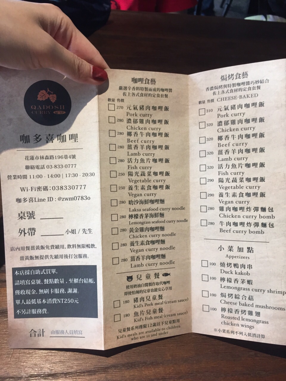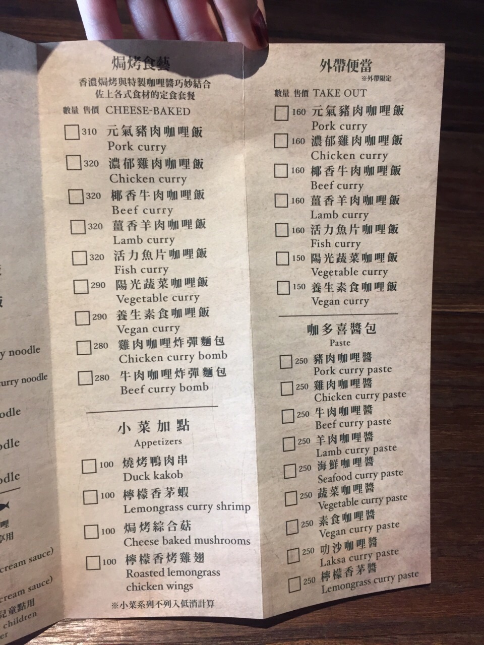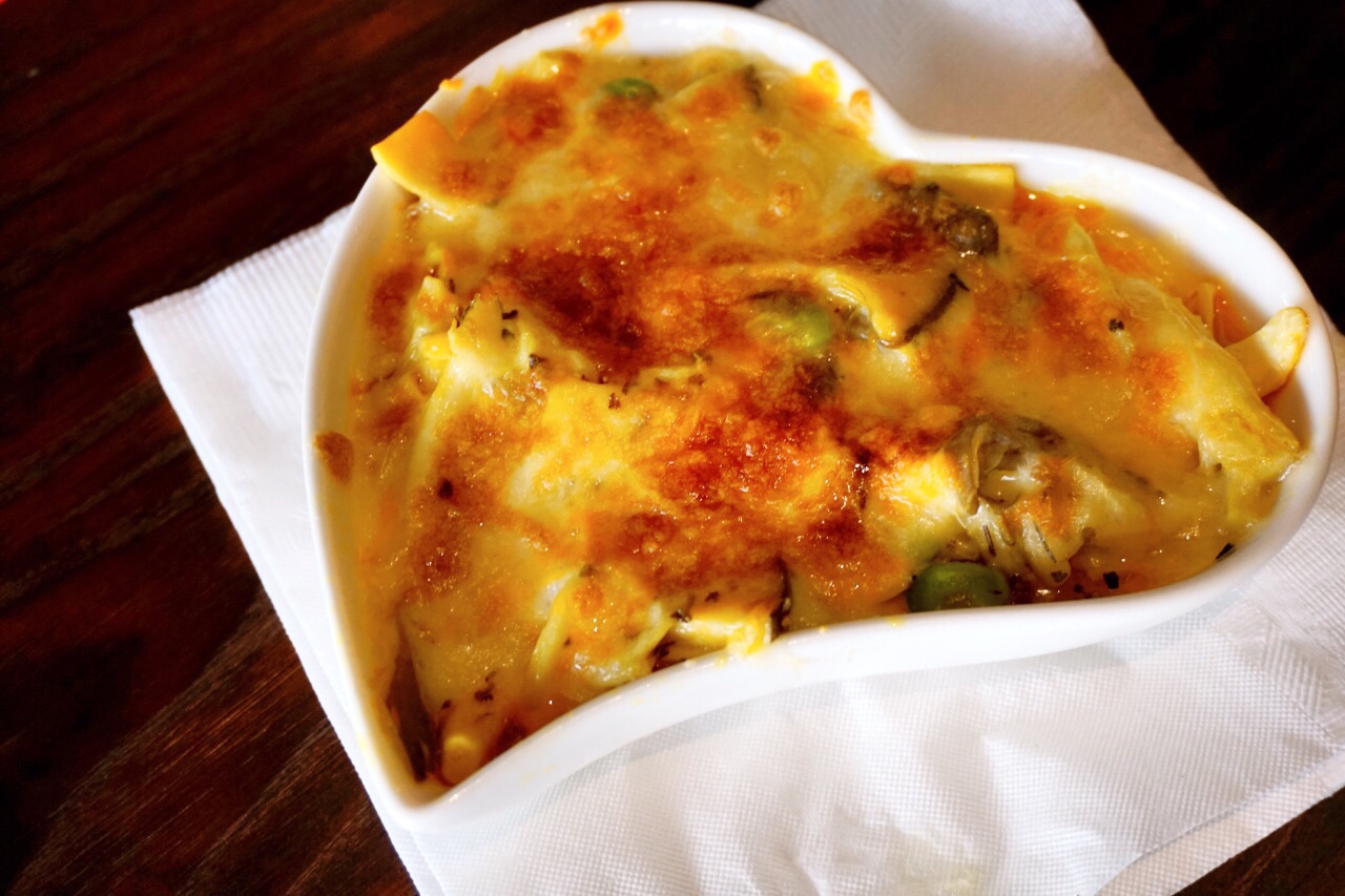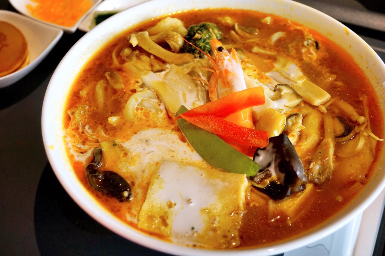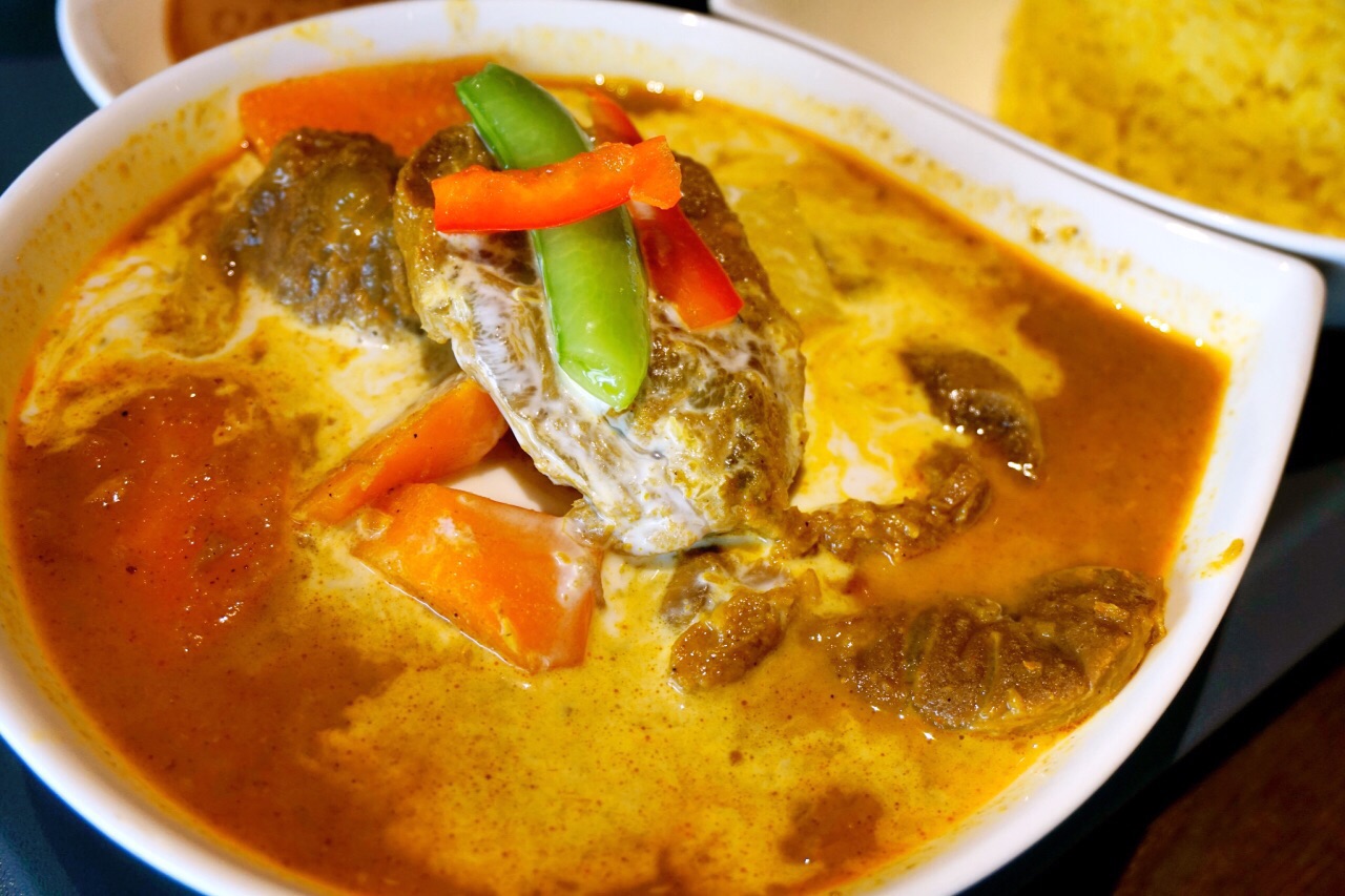 民宿老板推荐餐厅清单上的一家,我们俩都是喜欢吃咖喱的孩子,所以第二天的午餐毫不犹豫的就选择来这家了。 街道虽然很小,但是店面却不小,店内面积比较大,座位也很多,并且中午吃饭时间上座率都还是非常高的。 看了看他家的菜单,有点属于马来新加坡风味定食套餐的类型,每种都搭配了小菜,小吃。姜黄饭是免费添加的,饮料自助无限畅饮。有冰红茶,奶茶,咖啡,而且都不是那种很敷衍的东西呢。 【叻沙海鲜咖喱面】280,这碗实在是很大呃!配菜丰富,分量足到爆!叻沙味道很正,咖喱和椰浆香味特别浓。汤虽然热量很高,但还是忍不住多喝几口,非常好喝。面比较粗,很有嚼劲,虽然也不算很入味但是因为这款面汤底的口味本来就厚重,所以吃起来也是相当合适。里面的海鲜都很新鲜,虾肉很Q,龙利鱼肉细嫩。 【椰香牛肉咖喱饭】280,咖喱很浓郁还有点回甜的味道,这个椰浆也加得比较足哦。这份的牛肉也不少,而且又大片又厚实。也是腱子肉部分,虽然瘦但很软嫩,完全浸入咖喱酱汁轻轻咬一口配姜黄饭真的是太美味了。 【焗烤综合菇】100,芝士焗的一道加点小菜,马苏里拉芝士醇厚香浓,里面的菌类就显得水垮了一点,整体一般。 定食内的小菜都不太喜欢,玉米笋黄瓜那个淋的是橙子酱,橙色那个什么没看出来也是甜甜的。迷你铜锣烧实在是不太好吃,只咬了一口。 注:这家是餐前自助买单,菜单上自己填写桌号,勾选菜品然后至前台买单。只收现金,不能刷卡。有低消,每人最低消费250新台币。没有服务费。