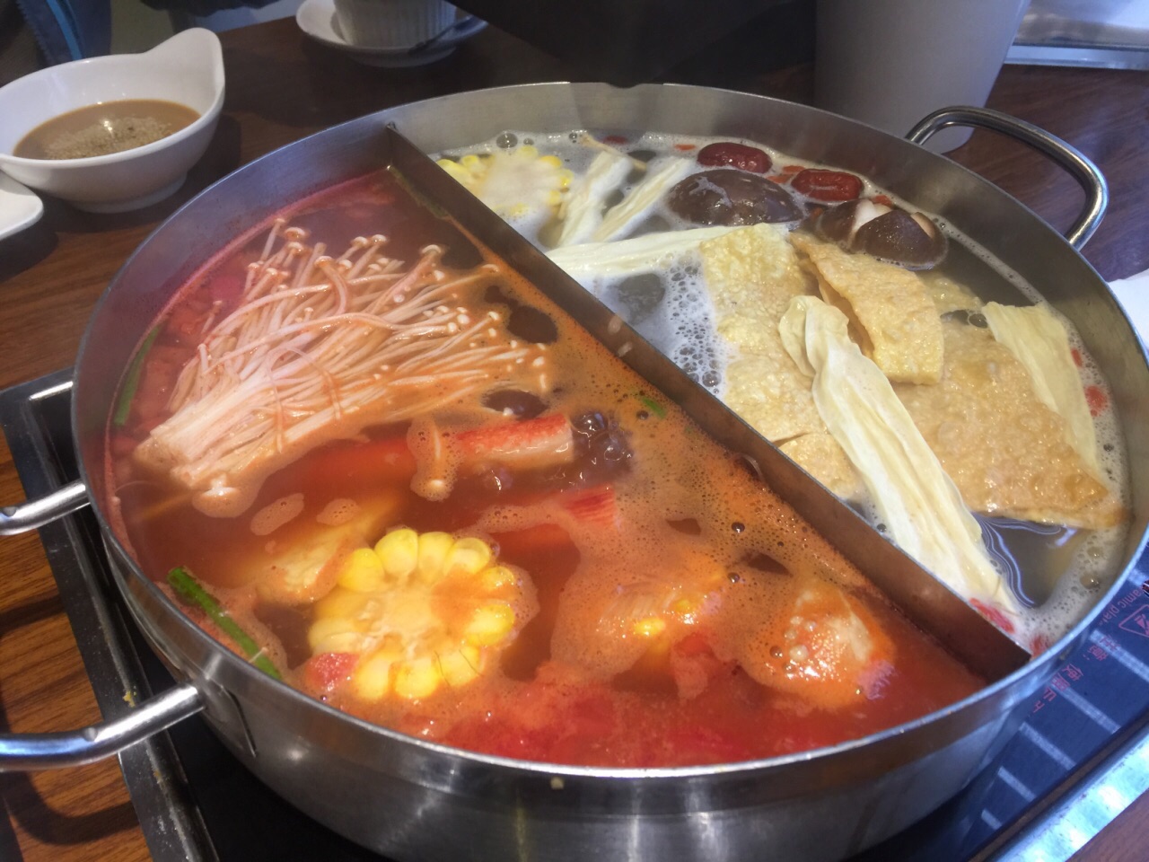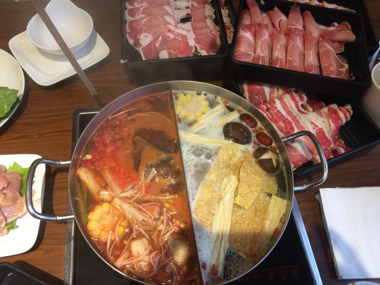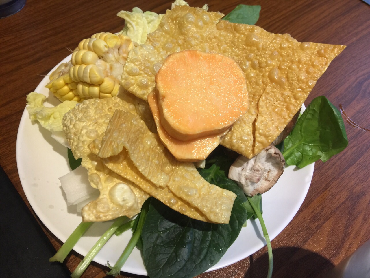 在朋友家附近的商圈,这家面门看起来挺大,中午人气很旺几乎是满座,这家店主推自助火锅,有好几个档次可供选择,我们没选海鲜类的但大部分肉都可以点,锅底也有几种搭配。点了番茄锅也算是特色,服务员帮我们各种肉类都来了两份,主要是牛肉和羊肉,薄薄的一片,下锅后涮一会就好了,相对来说羊肉会更嫩一点,但不算很鲜美。蔬菜是自己去自助台拿,还有些饮料都是免费的。总体来说性价比还行。