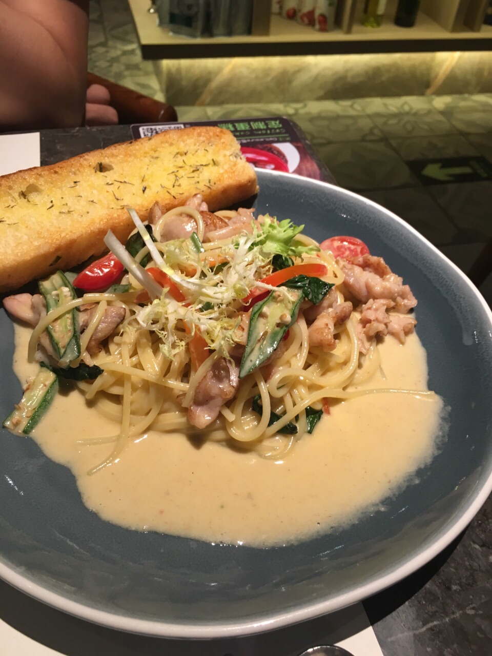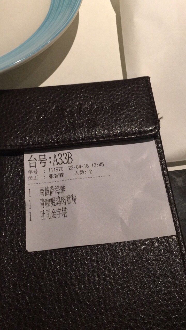 来这里庆祝纪念日,随意在网上搜到的没想到现场人多需要排队超过十分钟。店里以创意菜为主,看完菜单我们都觉得这家内容有点料,菜谱选择很多。两个人点了青咖啡鸡肉意粉,第一次吃青咖啡意粉,很新鲜,味道还真的可以得好评,酱汁味浓很让人想一口接一口。还有吐司金字塔,颜值我想给两百分,奶油多多雪糕多多用来慰劳我的胃的。太满足,太爱这种甜品了,以致于后面的海鲜局批萨我们都只消耗了一半就战败了,里面有丰富的海鲜料,只是上面搭着批萨饼皮不是太搭。喜欢这家,会再带朋友来的。