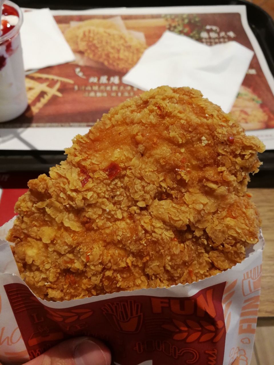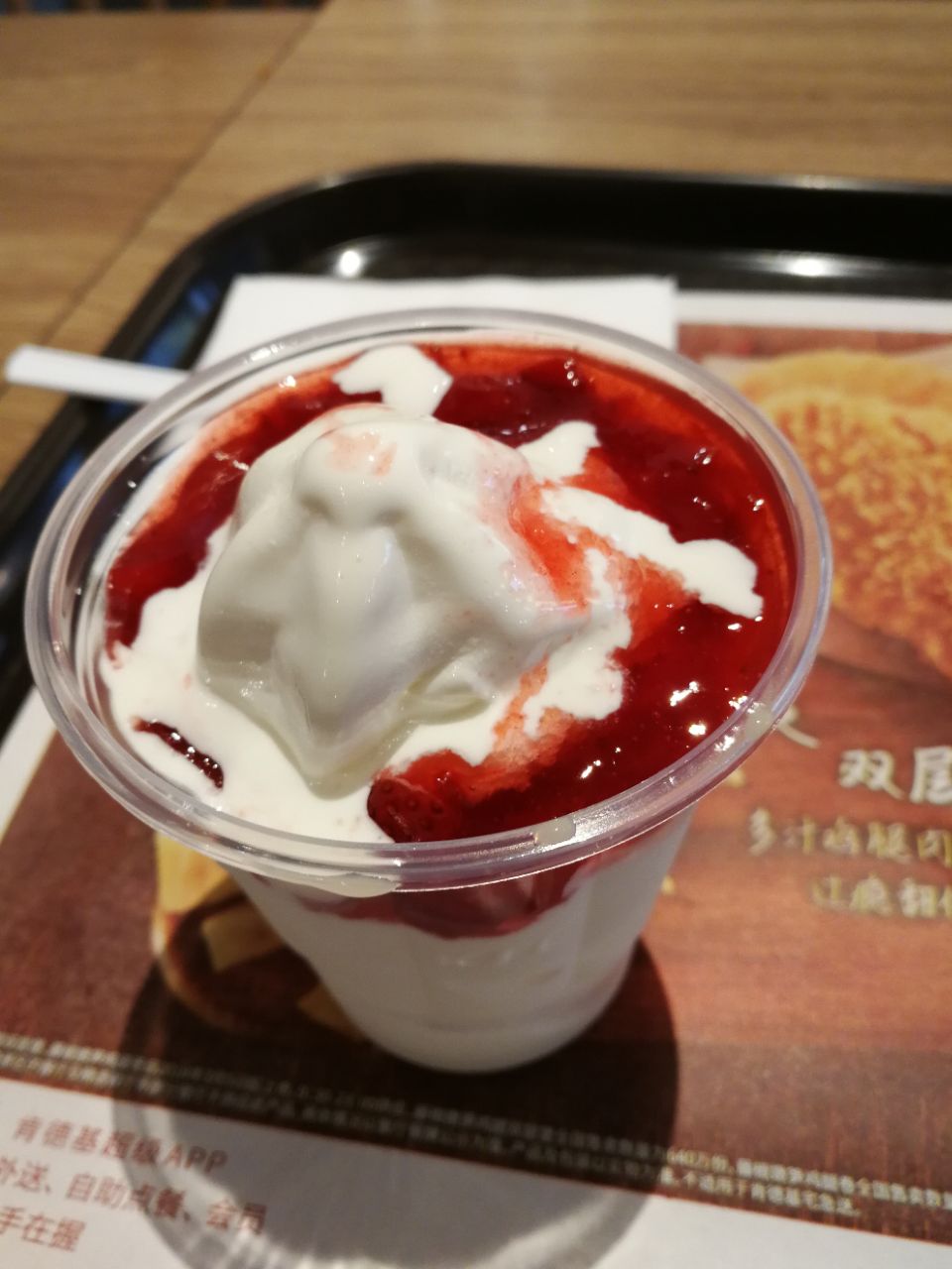 这家肯德基几乎都是自助点餐了,有的顾客想人工点也被服务员尽力推荐自助点,这样也好不用排队。买了新品黄飞红肯大大鸡排,还有草莓圣代。这个鸡排比之前的藤椒鸡排好吃,更嫩,更香,也不辣。圣代就差强人意了,都快融化了,改天试试魔鬼辣脆皮鸡。