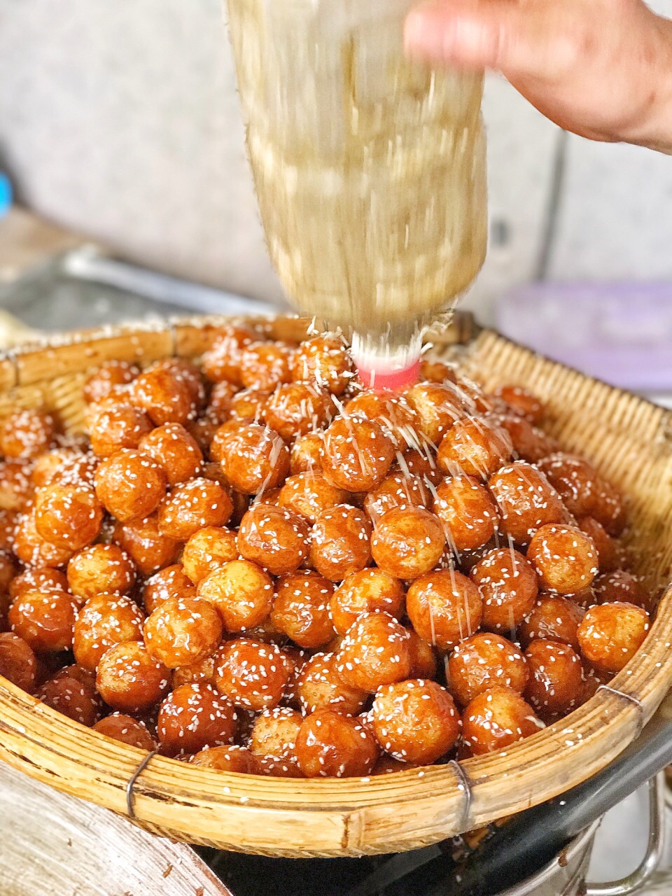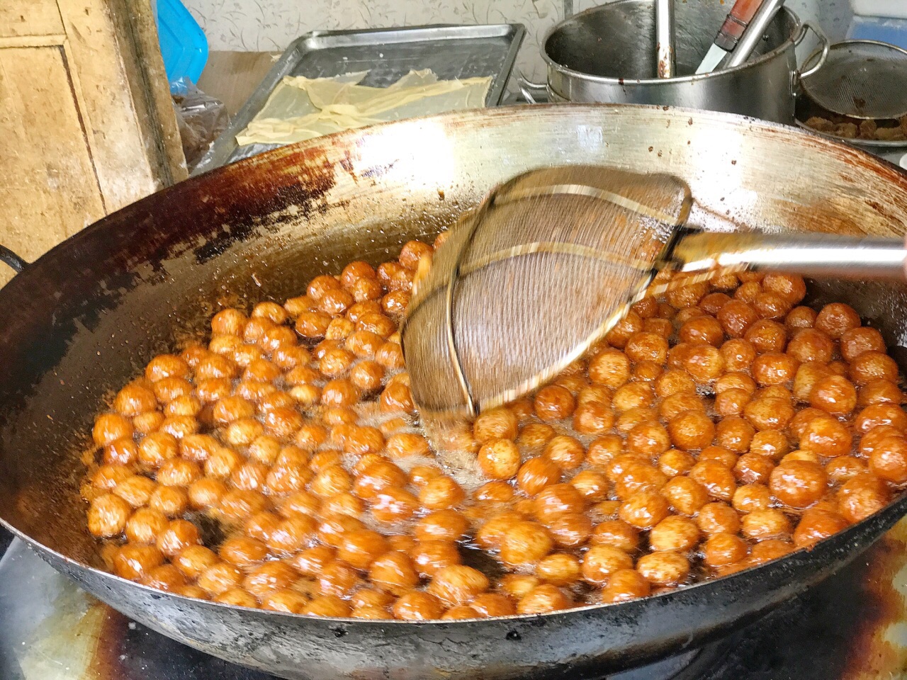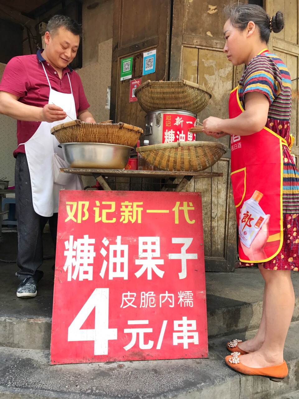 总评: 当我咬下第一口的时候,我听到了咔嚓作响的破裂声,快感动哭了。 有多久没吃到这么这么脆的糖油果子了呢?记不得了。 切记,新鲜出锅的糖油果子一定要放凉了再吃,因为凉了才会脆! 也不能放久了哈,太久受潮了,也就软了。 总之,一定要在最恰当的时候食用,那样才是美味的最佳时刻,不可太随意了。 评分:92分 性价比:❤❤❤❤❤ 他们是有正式门店的,虽然招牌也就是一个破烂的木板而已,但是总比那些流动的小推车要稳定啊,不用担心找不到卖家。 老板是夫妻俩,一个炸糖油果子,一个在旁边打下手,态度都很好,特别配合顾客拍照,也会提醒客人不要太心急,凉了吃才最好。 看他们笑呵呵的做生意,感觉也很甜蜜哦,是那种很知足的平凡幸福。 糖油果子,一串5个,4元一串。比起那些软趴趴的伪糖油果子,这个价格真的是太超值了。 在宽窄巷子随便找一家也要好7元钱吧,关键是还不好吃! 我到店的时候,老板还在炸糖油果子,看他不断的在油锅里翻转这些果子,确保每一颗都受热均匀,上色充分,也是挺费劲儿的。 火候够了,时间充足了,可以起锅了。再均匀的撒上一层香香的白芝麻,用竹签穿成串,完成! 刚开始拿到有些迫不及待,在还没冷透的情况下吃了一颗,味道还是蛮好,只是有点软韧弹牙,还有点粘牙。 等到冷透了,咬了一口,那种感觉完全不一样,有种吃冰糖葫芦的感觉,特别脆特别香。 这糖油果子也很好看啊,大小一致,色泽油亮晶莹,跟琥珀一样剔透光滑。 反正我是吃完一串,立马后悔了,怎么没多买几串!根本吃不够呀! 下次必须吸取教训,一次多买几串,吃满足了才行。