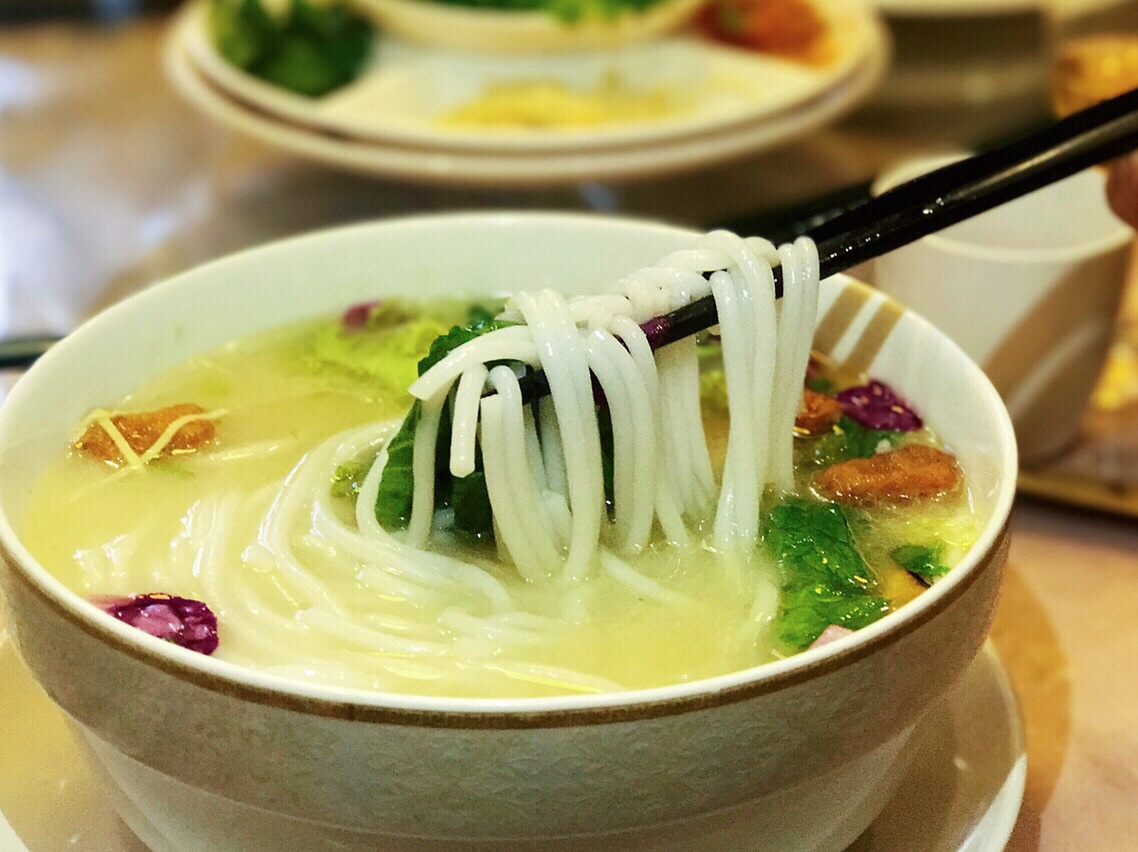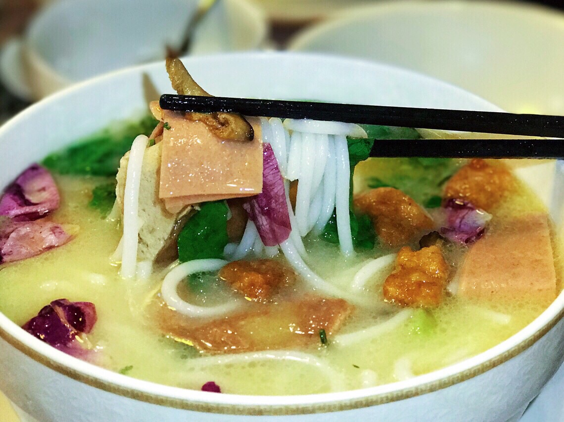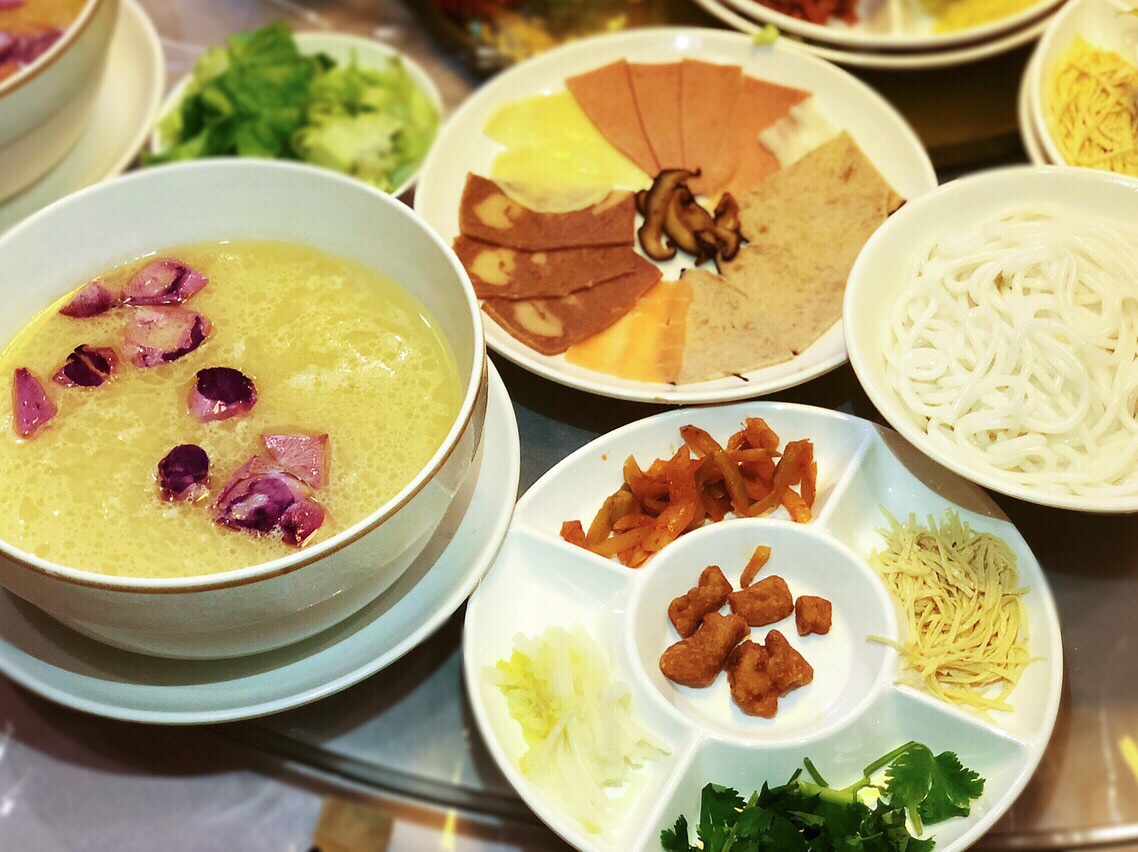 净心缘素食餐厅在昆明是一家非常有名的素食餐厅,店里的素食种类特别多,有自助素食、有自助素食火锅、有素食点菜、有素食过桥米线、有素食冰淇淋等等。 他们家的素食自助一直价格很低,所以有许许多多的人都会到这边来享用素食。听说他们家有素食过桥米线,许多人是慕名而来,品尝了他们家的素食过桥米线都赞不绝口! 过桥米线上桌的时候由四部分组成,首先是配菜盘包含“蔬菜盘”、“素菜盘”和“荤菜”,荤菜都是用魔芋、植物蛋白等制作而成的,但是看上去超级像真的。然后是米线,份量十足的一碗。接着是小食碟,包含油鸡枞、苹果、豆腐干。重头戏来了,最后是一碗滚汤的汤!将各种食材依次放入汤中后,用勺舀一勺汤品尝,清甜浓香爽口。这碗纯素的汤毫不逊色肉汤,用蔬菜、坚果、菌类熬制的过桥米线汤,根本不会让你觉得是在吃素! 我们还品尝了其他的素食菜品,强烈推荐手撕鸡、素荷包蛋(太阳果)、素铁板鱿鱼… 用拉丝蛋白制作的素鸡炸制以后,口感和味道和真的炸鸡几乎差不多,越吃越想吃,搭配上素啤酒(白麦汁)真有一种啤酒配炸鸡的意思。 素的荷包蛋简直不要太惊艳,居然流黄的荷包蛋都模仿出来,蛋黄的部分是用南瓜做的,口感和味道也是超级像一级棒。 用杏鲍菇制作的铁板鱿鱼,把外形制作的一样,口感和味道也做出了鱿鱼卷的Q弹,很好吃! 还有许多素食也非常让人惊艳,素肥肠、素口水鸡…从口感到外形和味道无一不像!