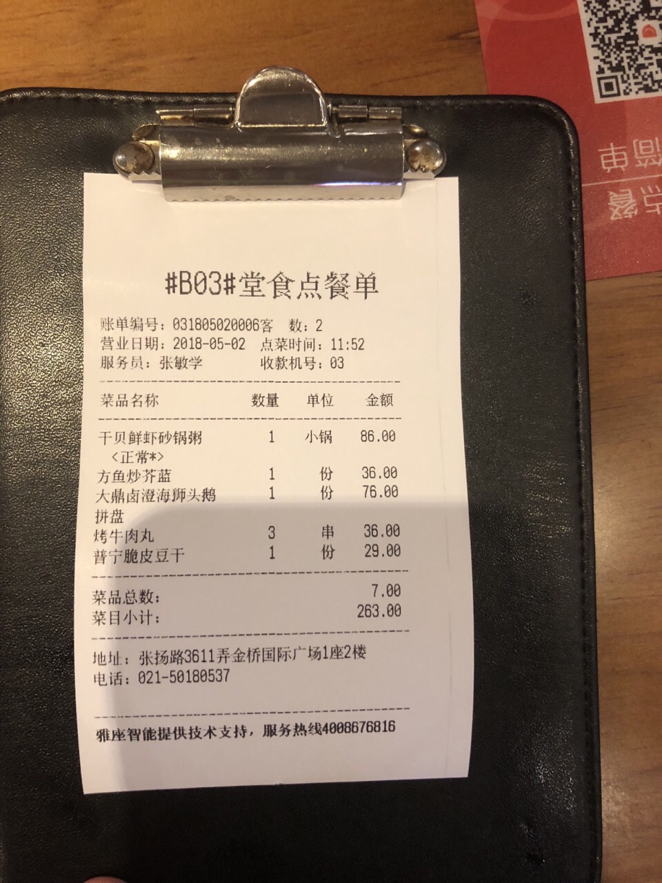 2018年5月2日,感谢大众点评和店家给了我这次机会,离家近,正好带老妈出来一起拔草。 #位置#金桥国际1号楼2楼,直达电梯一出来就是了。 #美食#大鼎卤澄海狮头鹅拼盘,口感清爽,有两个酱,酱油色的酱,个人感觉比较油。透明的酱,有点酸,个人感觉很爽口开胃。鹅肉很嫩,一吃就停不下来。 方鱼炒芥兰,小小的方鱼块有点硬,感觉像是风干的鱼块。芥兰很大颗,很脆。口感清单,适合感冒中的我们。 烤牛肉丸,个人感觉像是纯手工打发出来的,不是包心的,我很喜欢,一口咬下去,还会飙汁。 普宁脆皮豆干,豆干本身就是清单的,酱汁是亮点。透明的酱,有点淡,个人比较喜欢。另一个酱是辣的,对于不能吃辣的人来说,是超级辣(捂脸)。 干贝鲜虾砂锅粥,正常款就够2个妹纸吃撑了。7个大虾,有干贝,还给一个蘸虾的酱,个人没有使用,因为是辣的。另外的三连碟是放进粥里的配料,我们没放。粥很糯,很鲜,个人觉得不需要配料也很好吃。 #服务#很好。一上桌就给我们倒柠檬水,还会时不时的来补水。每次送菜上桌,还会提醒我们一些不知道的事。 #总结#老妈和我都吃撑了。店家也没有因为是霸王餐的缘故而少量,真是一家良心店,我和妈妈都十分满足