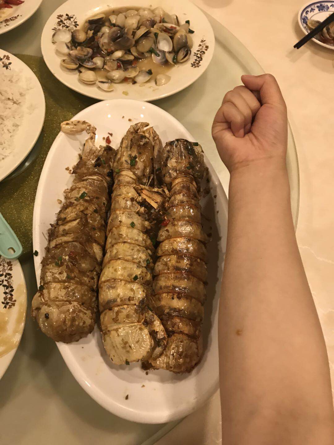 在长滩的几天吃的最多顿的地方地理位置佳,近DMALL入口,绿皮超市斜对面。店铺在当地算很大了,最主要是有空调!!!老板和服务员都是中国人,交流无障碍。菜品也是中式爆炒,适合中国胃。 第一餐是导游给的团餐,8菜一汤,除了一条mini石斑鱼和一盘猪头肉几乎全素。却是最怀念的一顿,要知道岛上蔬菜多难得啊?那么多品种和口味的蔬菜自己去吃是别想了。 后几次去都是觉得店里烧的口味好。单位旅游么有老有少自然要选大家都能适应的中餐。海鲜要早点去,晚了抢都抢不到。价格据说是不便宜,可那么多海鲜在啊,反正在上海是肯定不止这个价。