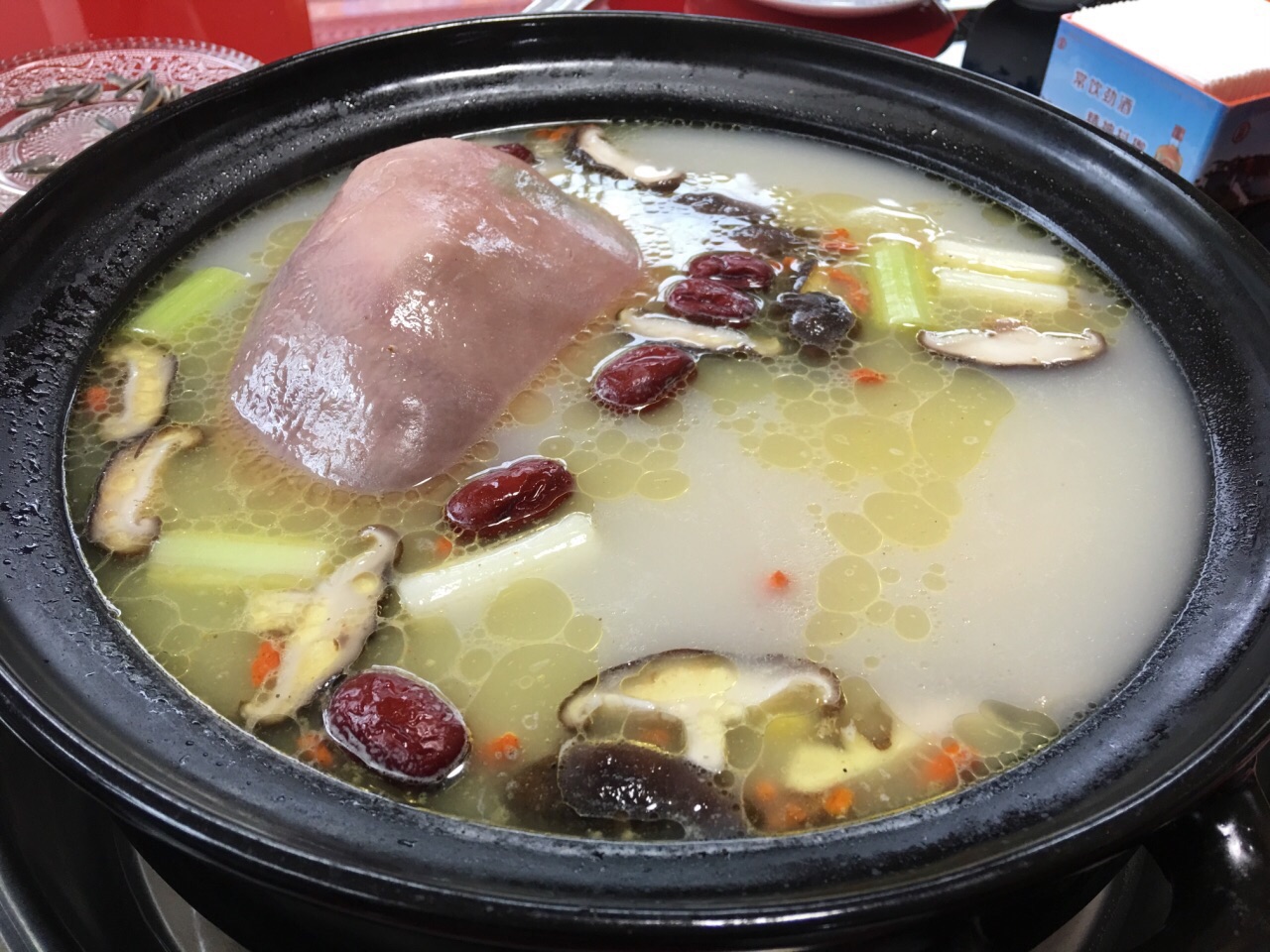 珠峰回来到这家店觅食。环境比较普通,服务员对于网上的团购券一无所知,都搞不清楚状况,一切都要问老板娘才行。这个方面应该得好好培训一下。客人一问三不知怎么行呢。饭前还有瓜子磕磕,酱料比较少,看看都没什么好吃的。拌猪耳味道不错,汤汁还可以当酱料,味道很好呢。猪肚鸡很大一锅,里面有菌菇枣子药材等,还一个猪肚包鸡。端上来之后,服务员把猪肚鸡捞起来拿到一边开膛破肚,猪肚切丝,鸡切块,然后把切好的东西全倒进锅底。汤的味道是挺鲜美的,喝了好多,猪肚还可以,鸡肉觉得一般,肉质感觉有点腌制过的,颜色和口感都一般。我们还点了一个好像黄喉吧,我去,好腥,真是没法吃,还好没全倒进去,只放了一两块,果断找老板娘把这盘东西给退了。
