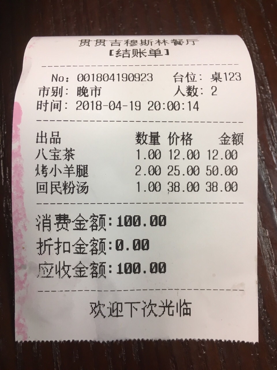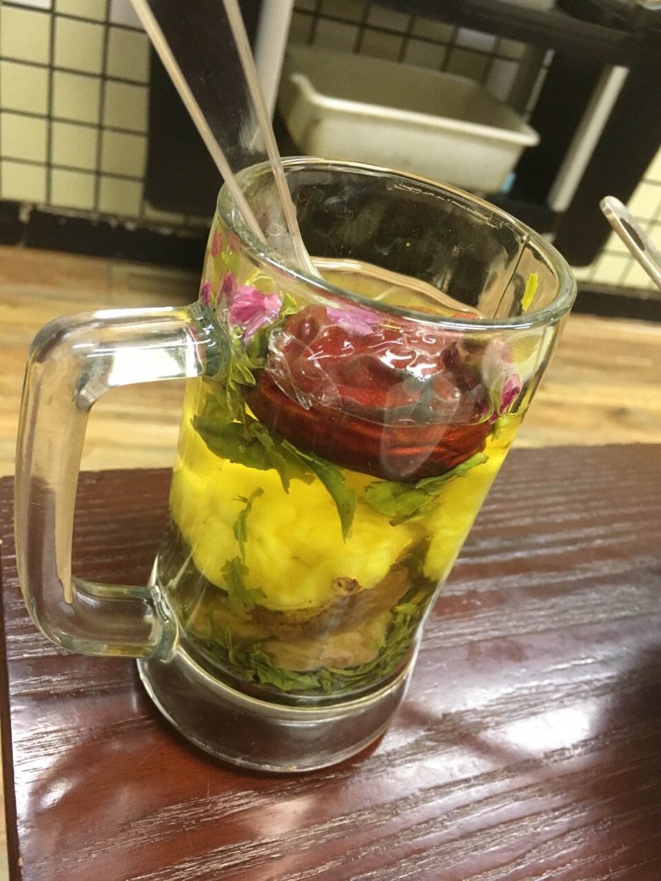 两个号称要减肥的人,吃完塞佰弄不算,再来这里补一顿… 八宝茶,用料很足,食材不错,口感也挺好,可以一直泡呢!带了一份回家,里面的菠萝好好吃! 烤小羊腿,其实就是羊棒骨,肉好多啊!超级嫩,如果不是连在骨头上,还以为是鸡肉呢… 回民粉汤,鸡汤做底,好吃!虽然肚皮已经饱饱,还是忍不住多吃了几碗… 很超值,口味也不错,下次继续!
