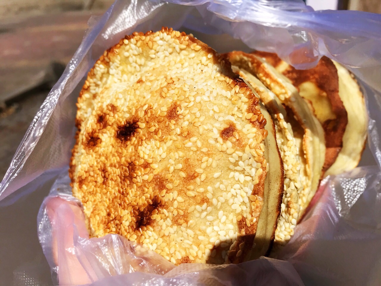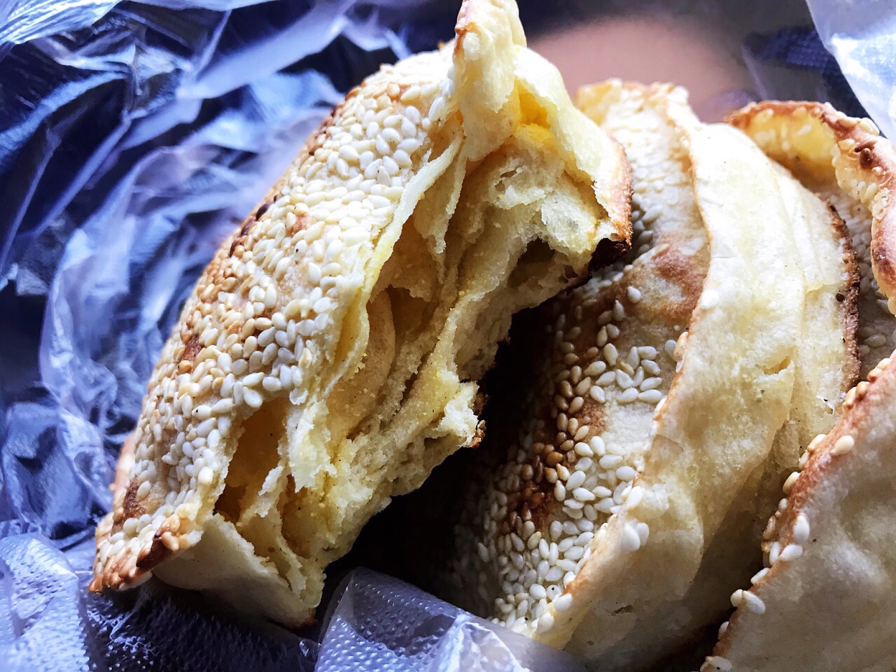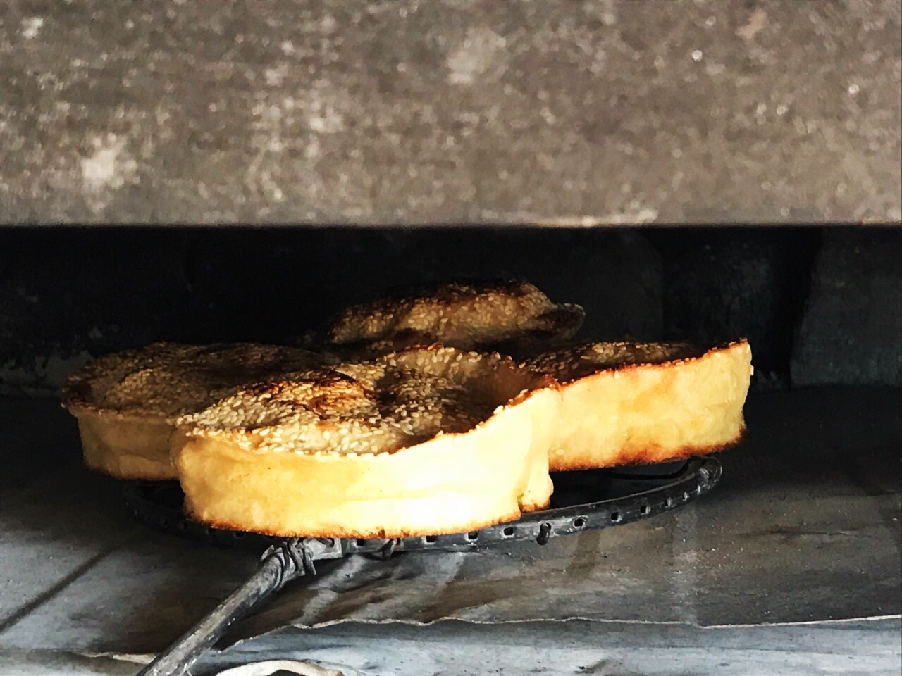 ✨ 凌源的烧饼独具特色,老身吃遍四海八荒也只在我大凌源见过这种烧饼 ✨凌源的烧饼属于吊炉烧饼,我们更习惯叫她缸炉烧饼,手工做好的烧饼胚子,少沾点水一下子贴在烤炉上膛,烤好的烧饼,外壳酥脆可口,表层的芝麻面香气浓郁, ✨ 烧饼一定要吃是刚出炉的,拿着烫手的,饼底脆里面分层柔软,软嫩咸香,不控制的话我一口气能吃4个!真是口感味道好吃到停不下来,曾经打包过烧饼带回给大连的小伙伴,香气散尽,口感也差了太多吃起来平淡无趣的一个饼 ✨这家店的烧饼并不是味道最好的,只是开在学校不远处,我高中的时候,课间操的时候时常会跑出来这里买烧饼,今日碰巧碰到打包一包情怀 ✨出门遇见一辽A牌照的车主打包了100个情怀烧饼