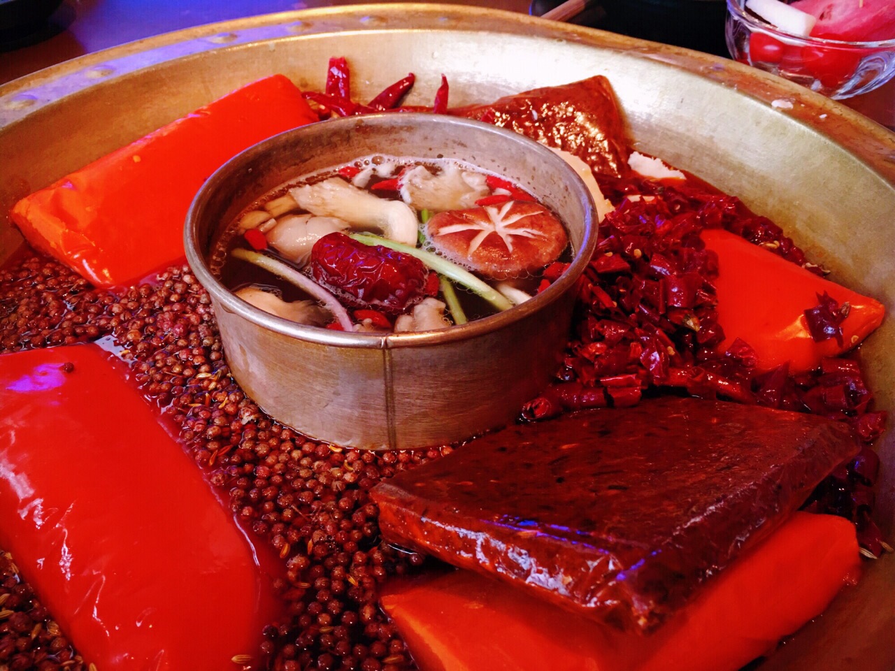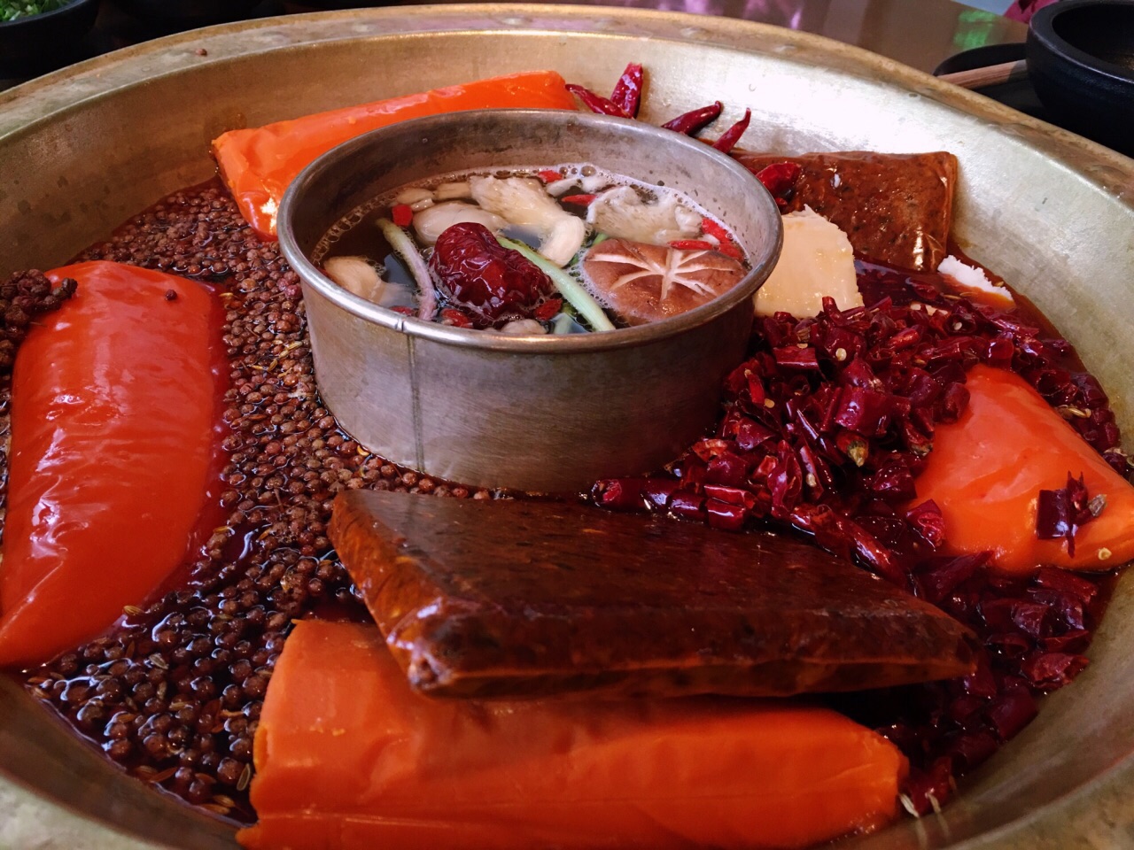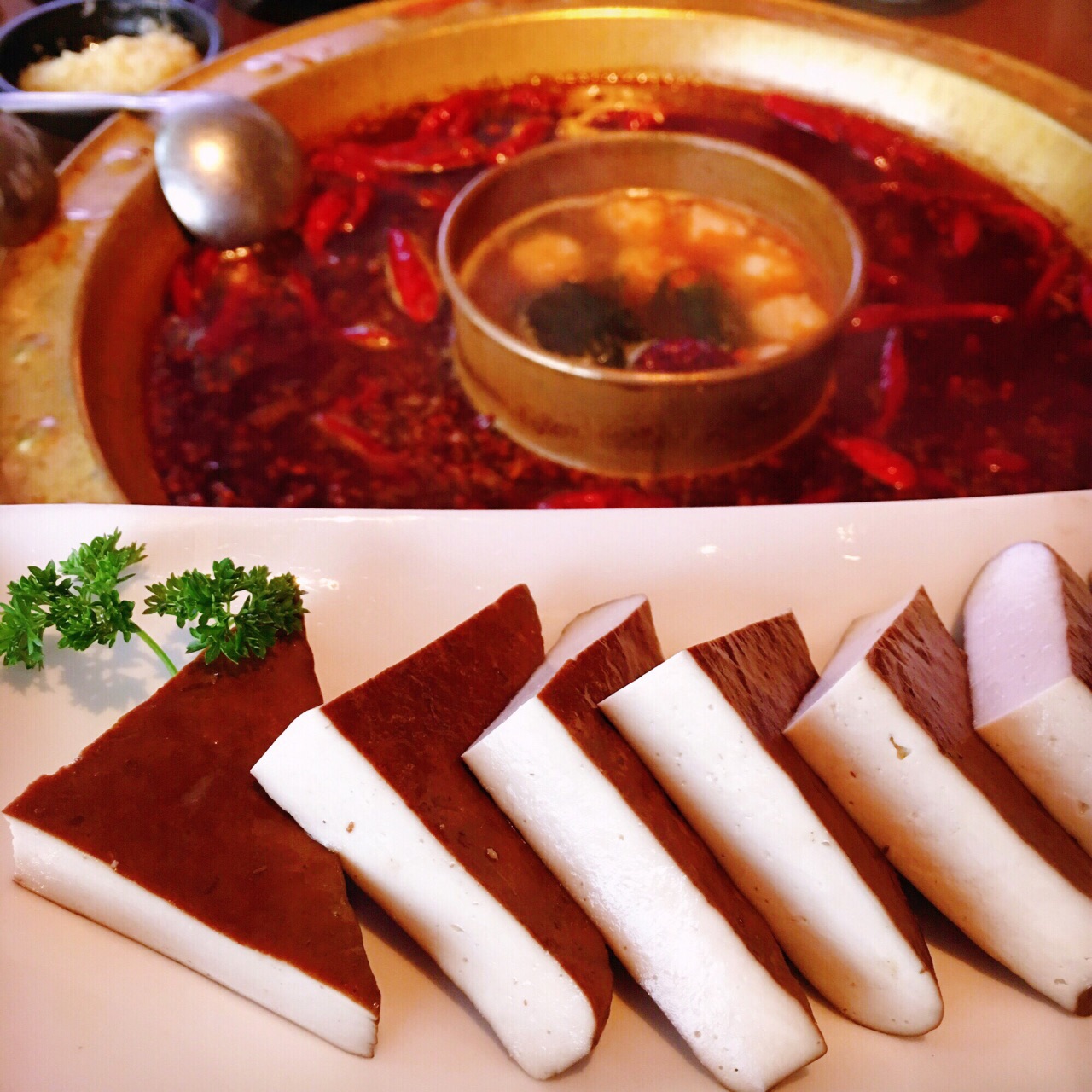 我与全世界就差一顿火锅️ 土火远看就像一团熊熊燃烧的『走』 既然来了火锅之都重庆必须走起啊 这家时尚火锅店自带可以看风景的露台 还未进店扑鼻而来的辣油香味肆意飞扬 九尺鹅肠粗略丈量一下跟胳膊差不多长 坐等开锅煮沸之时不妨尝几块现炸酥肉 看海味鲜海带芽和豆皮在水中群魔乱舞 论北海道蟹肉棒和虾丸在锅中谁煮沉浮 清新爽口的古作桂花小汤圆适合解解辣 美容养颜的桃胶莲子银耳羹可以败败火 哪怕从你的全世界路过依然放不下火锅
