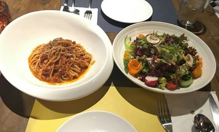 ...,其中的金枪鱼披萨个人很愛吃,蔬菜沙拉也很好,橄榄油拌匀的,润而不腻,不干不柴,值得推薦給大家