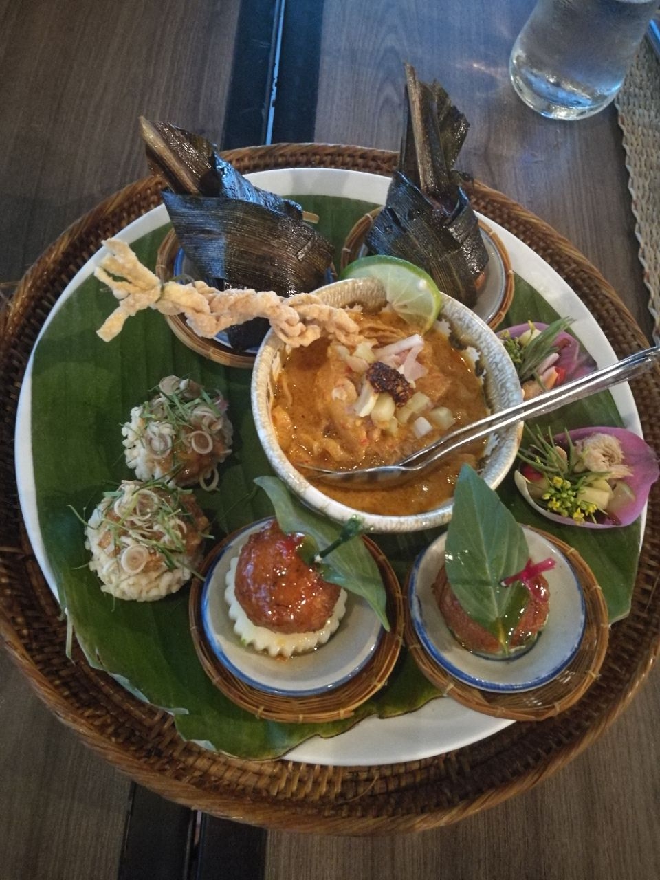 前菜套餐很棒,尤其是包着叶子的烤鸡和中间的那碗咖哩面。很有特色的餐厅,位置比较多,周末也不用订位