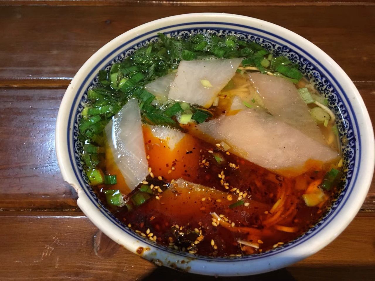马三喜兰州牛肉面:位于长椿街西向几百米,大成广场底商一层。 初夏的北京,中午来上一碗牛肉面,汤汁清爽,辣油红亮,几片白萝卜片儿漂浮其上,几搓小葱叶点缀其中,卖相喜人,味道也佳,口腹俱得满足。 此店第三次来了,每次都为这碗拉面而来,味道稳定,从未负我期待。店家与食者的关系如朋友相交,君不负我,我不负君。天热,但内心清爽,惬意。