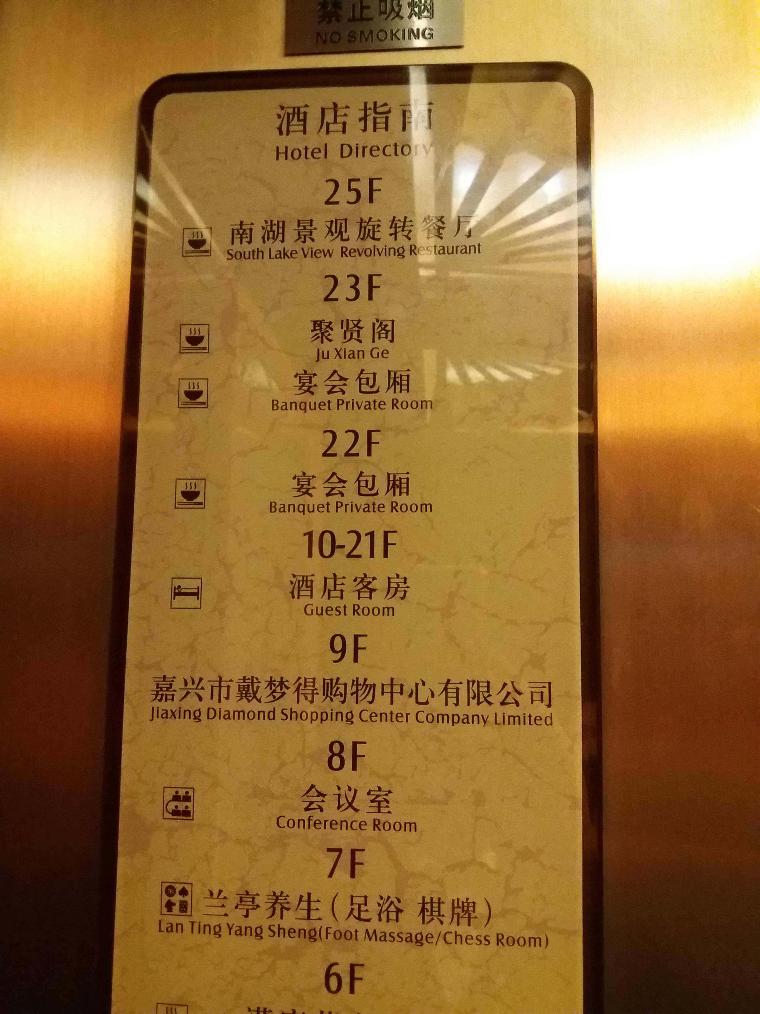 1、戴梦得旋转餐厅位于嘉兴市秀城区禾兴南路520号戴梦得大酒店25楼,似乎是嘉兴市中心占据制高点的餐厅。 2、餐厅内部陈设及装修,都已显得有些“陈旧”和“老式”了一点,餐厅内服务员也很一般般,走进25楼的旋转餐厅,根本那种走进“高大上”消费场所的感觉。 3、餐厅的菜肴售价也不贵,味道更是大路货。 4、与其它旋转餐厅一样的就是:坐着就餐,一个小时转动一圈。从傍晚的天亮的时候,一直吃到天完全黑了为止。白天能够看到南湖的一部分,晚上,由于嘉兴晚上也没有什么灯光可以从高空俯瞰观赏,因而,就是在嘉兴城市高空,依然没有什么可看。 5、我们三人点了六菜一点心,共计360元(不含酒水),人均120元。说实话,没有一道菜是你吃过不忘的,因为,味道太一般太一般了,一般到了与路边的小餐饮店里烧出来的一样一样滴。