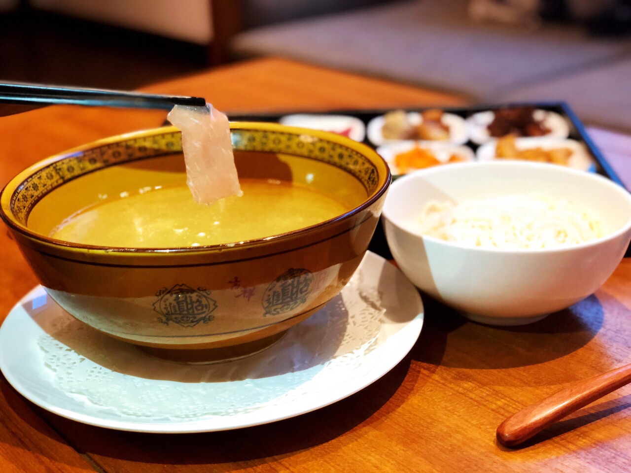 要不是别人推荐,我想我可能很难知道在昆明还有一家“蘅芷院精品酒店”,而且还在出售过桥米线。抽空去品尝了这家的过桥米线,个人觉得挺不错的,所以可以推荐给大家。 这里的过桥米线属于定制的,不是随便来都能够吃得到的,每天只准备20到30套左右。酒店的工作人员介绍,为了保证过桥米线汤的品质,所以每天只定量熬制。 跟着导航找到了这家酒店的位置,这是一个十分不错的院子,环境挺好,整体风格是大理白族风格和民国风格相结合。 过桥米线售价¥68一套,一个盘子台上桌,里边装着12小碟配菜。高汤上桌,碗的温度很烫注意不要碰到了。把配菜和米线陆续放入碗中,用勺舀汤喝味道清甜浓郁,能够很明显的感受到鸡的香味,没有明显的味精鸡精汤粉等添加剂的味道。 询问了大厨才知道,他们家的过桥米线是不使用任何添加剂的,为的是让自己的客人能够尝到云南人小时候正宗云南过桥米线的味道。 总体来说,这家的过桥米线我是比较推荐的!吃完以后没有任何口渴的感觉,反而非常的舒服,也不会感觉到油腻,所以好评!