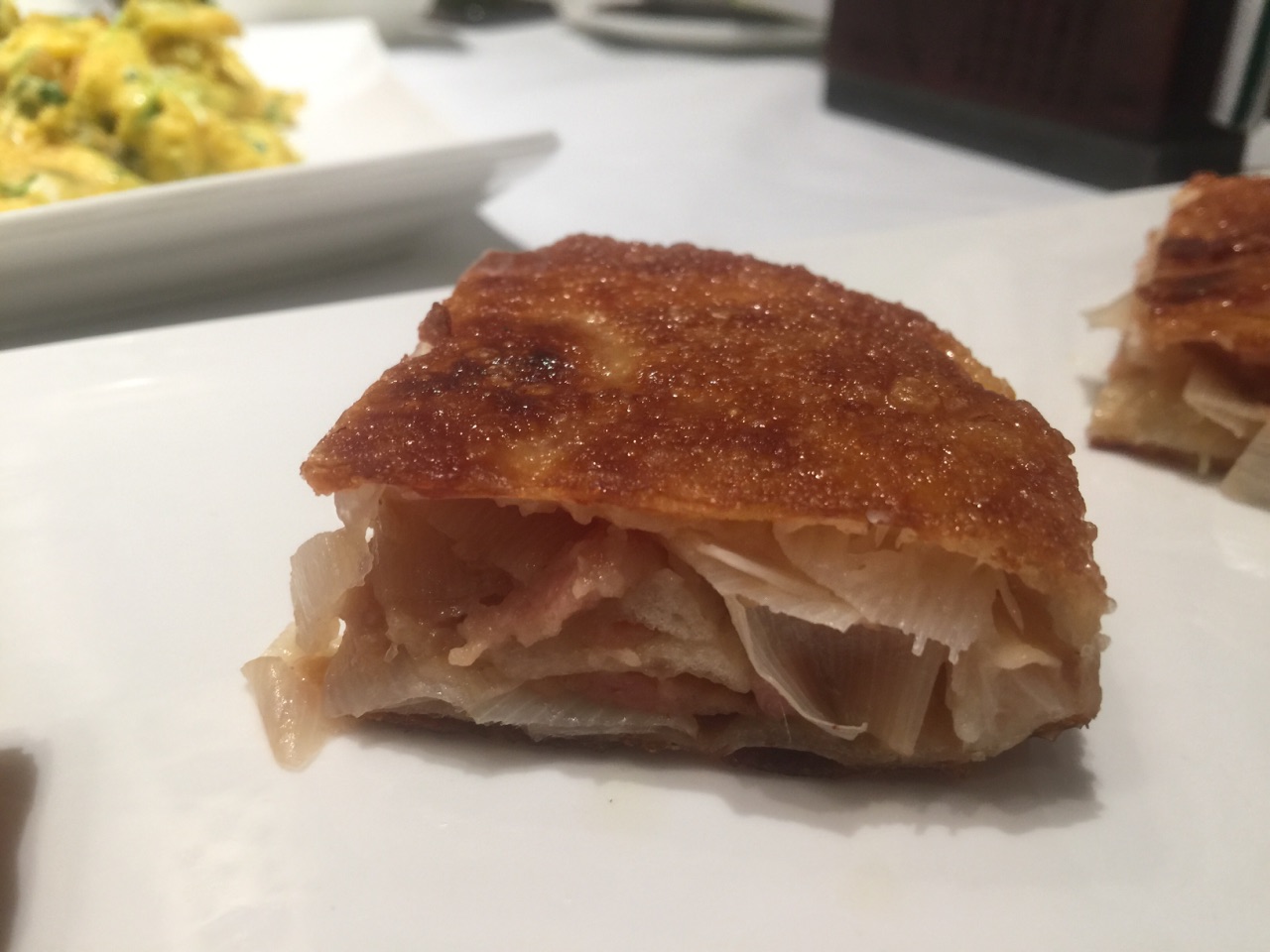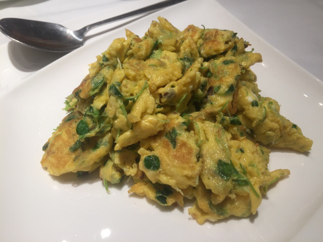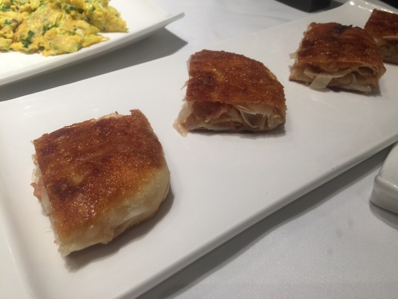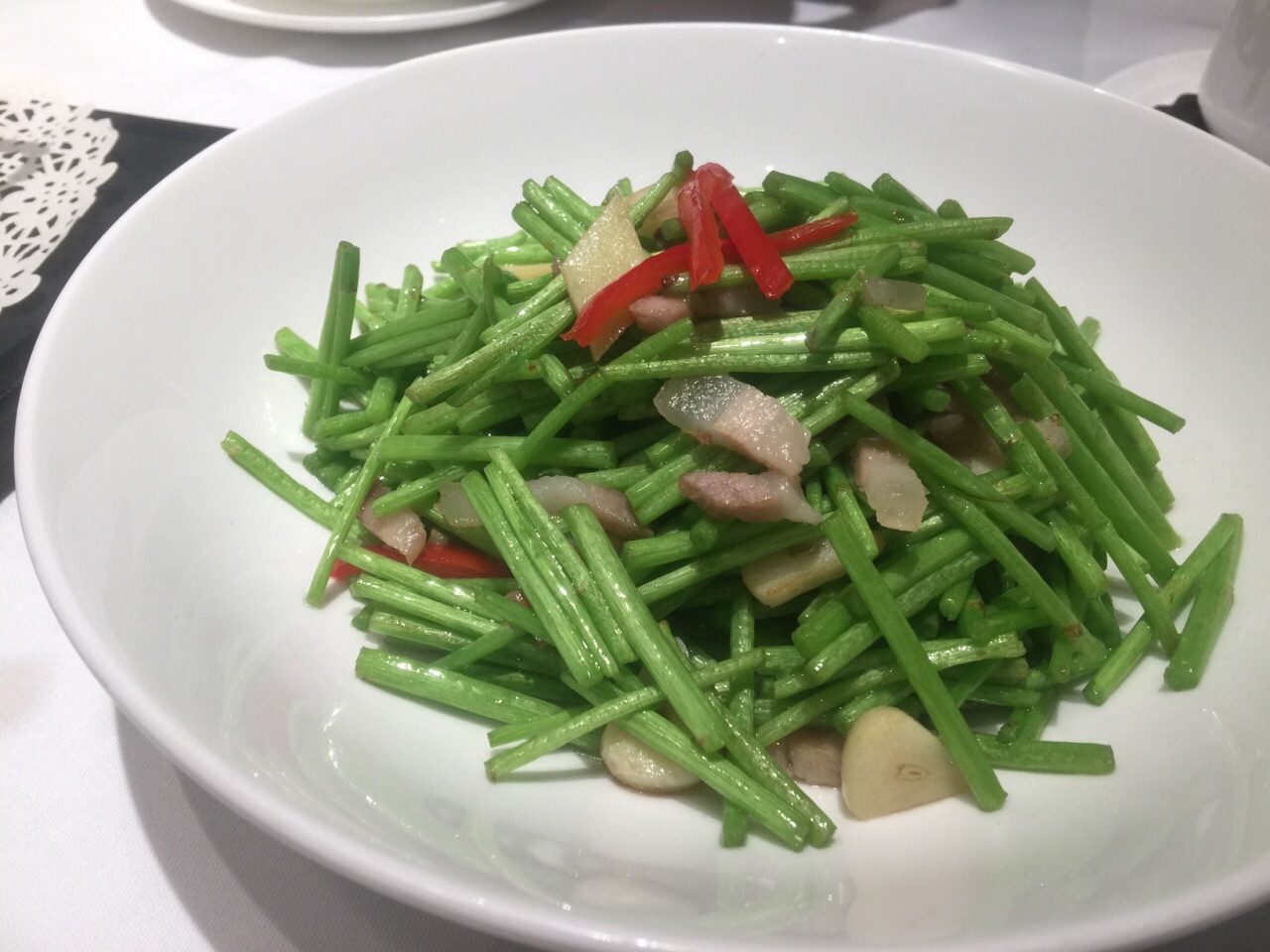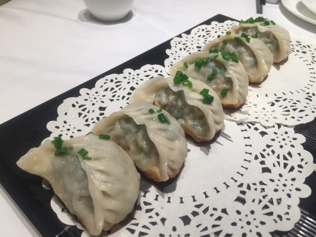 万象城离公司不远,偶尔会过去吃午餐。这家店也是朋友推荐的,环境很不错,比较安静有雅致,听着名字感觉是吃杭帮菜的,但还结合了点粤菜,总体来说都算偏清淡的。中午点心的选择并不多,点了虾饺个头不大还算新鲜,还有煎饺韭菜馅的,炸的微微有点脆很香,蘸点醋味道刚好,还点了招牌饼也是油炸的,外皮稍稍硬了点,还点了两个菜香椿炒蛋和蒜苗,都挺清爽的。适合朋友小聚或商务宴请。
