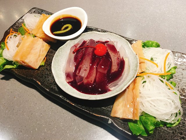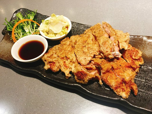 ...海的辣酱油,第一口咬下感觉像是上海美味炸猪排,但是肉质更厚实,煎炸之前有用台湾的调料特别腌制过