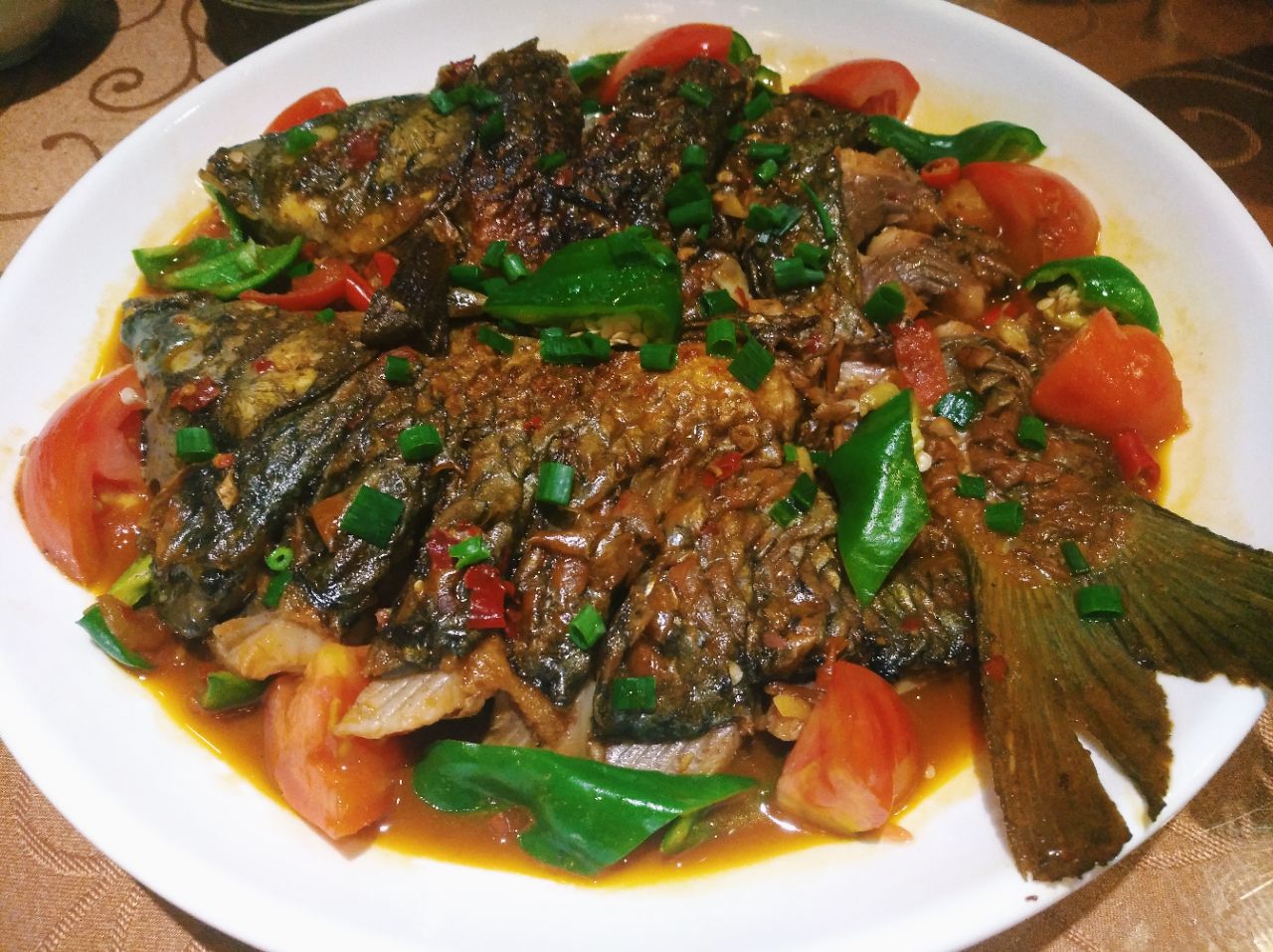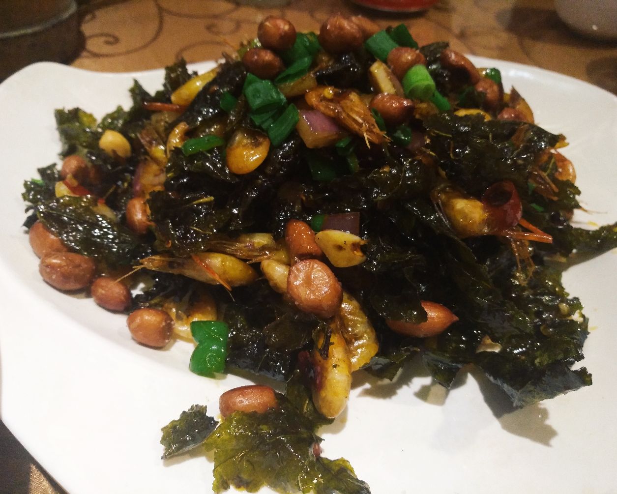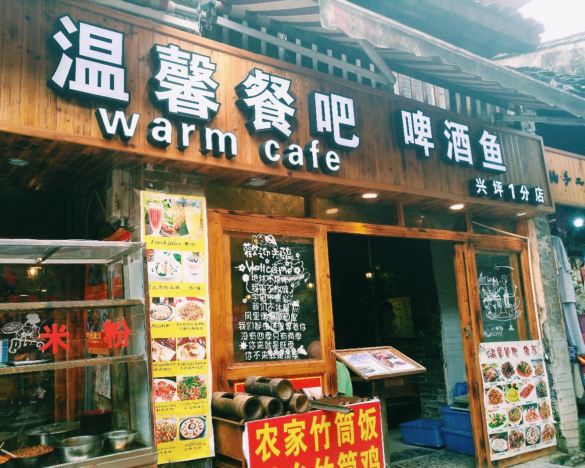 ,木质的桌子,灰墙绿叶,给人感觉很舒服。偏爱木头的我很是喜欢带有这一类的装修风格的店。 【漓江虾】一碟看着很小,但是吃起来分量很足。最特别的是这个是用茶叶一起炒的。炒过的茶叶吃起来感觉很像海苔。别的地方吃不到这样的漓江虾,好奇的朋友可以尝试一下。真的很不错。 【奇香茄子】我是一个不爱吃茄子的人,但是这个茄子我吃了一大半。真的很好吃,茄子油炸过一遍,很香但是又不会很软,吃起来又一点脆脆的感觉。 【啤酒鱼】啤酒鱼是去阳朔这边餐厅必点的菜,油炸过的鱼放入啤酒焖煮,味道特别的鲜美。鱼肉很嫩,吃起来很香,有淡淡的啤酒的味道。一条鱼分量还是挺足的,三个人我们都没有吃完。