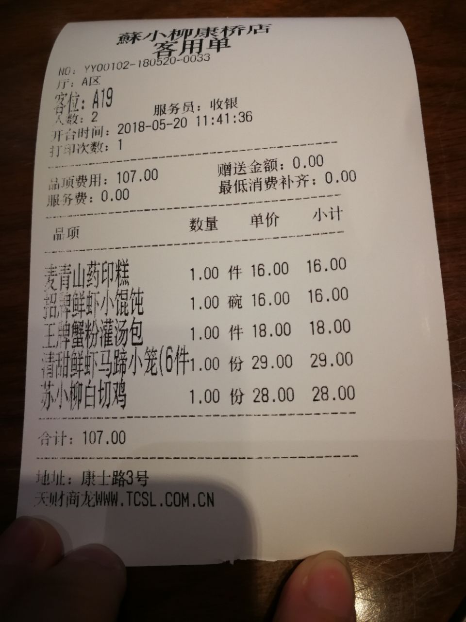 其实很早之前就想试试苏小柳了,这次正好在康桥附近,中午直接过来,没想到这个地方也要拿号等位,看了看时间不久就等吧,而且是需要拼桌的。如今这类型的点心店很多,感觉苏小柳还是很合我口味的。 麦青山药印糕,有点创意,颜色双拼,糕内掺杂着少许山药,还是货真价实的,口感清爽。 招牌鲜虾小馄饨,没有过多的调味料,吃口不会干,对于喜欢清淡口味的很合适。 苏小柳的小笼锅贴品种很多,这次点了鲜虾马蹄小笼,只能说还行吧。白切鸡还算嫩,28元价格过得去。 有机会还会到其他门店的苏小柳吃吃其他品种。