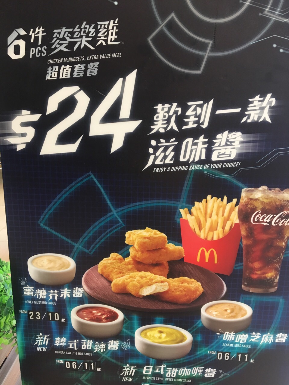 从西宝城的正大门进去,右手边第一家店铺就是麦当劳。西宝城位于香港大学的山脚下,有电梯可以从大学直接来到西宝城,所以这里的麦当劳很大部分是学生在这里用餐,蹭空调的同时,也可以便宜的吃上一顿。六块麦乐鸡是24蚊的价格,沾酱考虑到了香港大学来自于全世界的留学生的口味,有韩式甜辣酱、蜜糖芥末酱、日式咖喱酱、味噌芝麻等等。