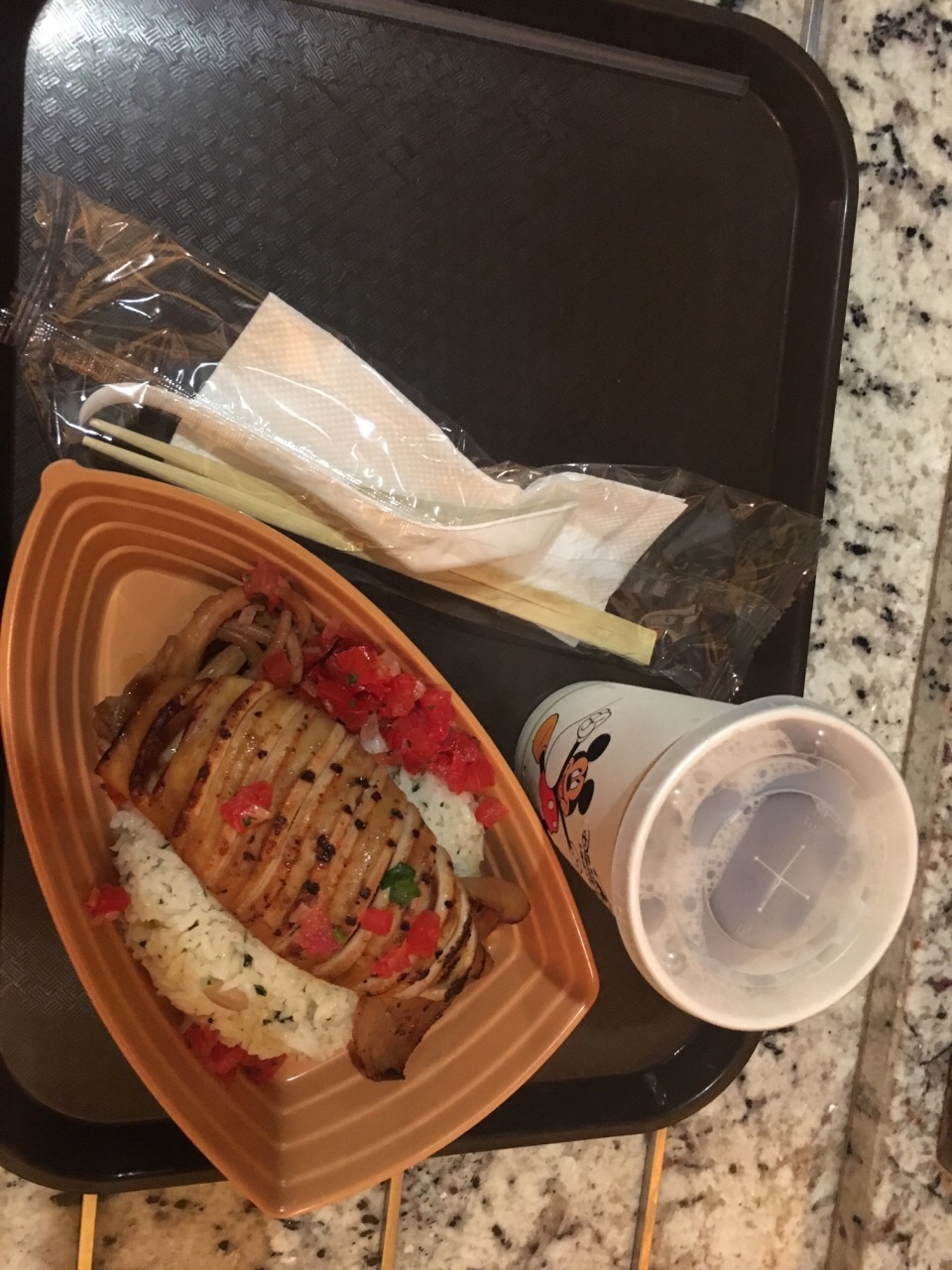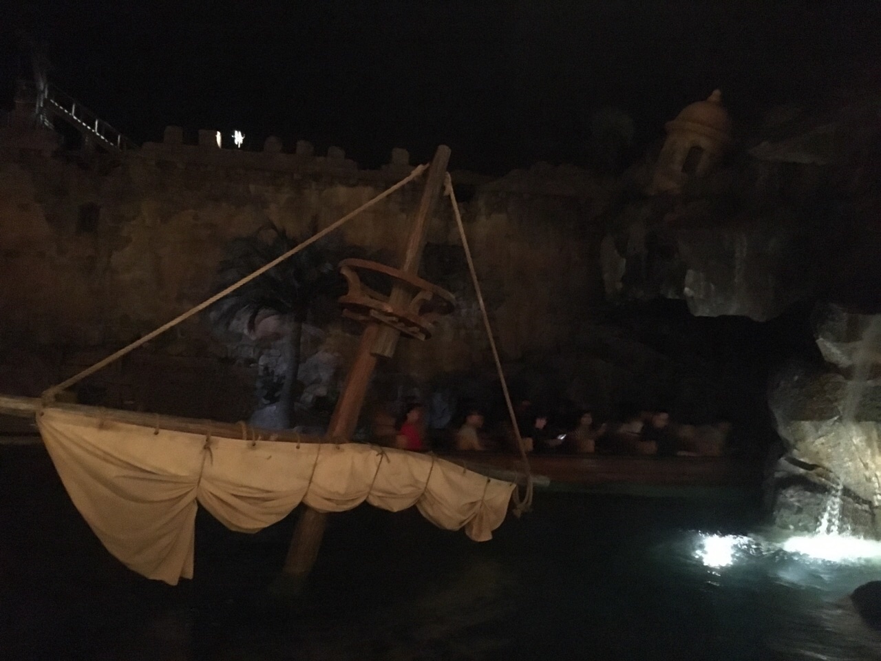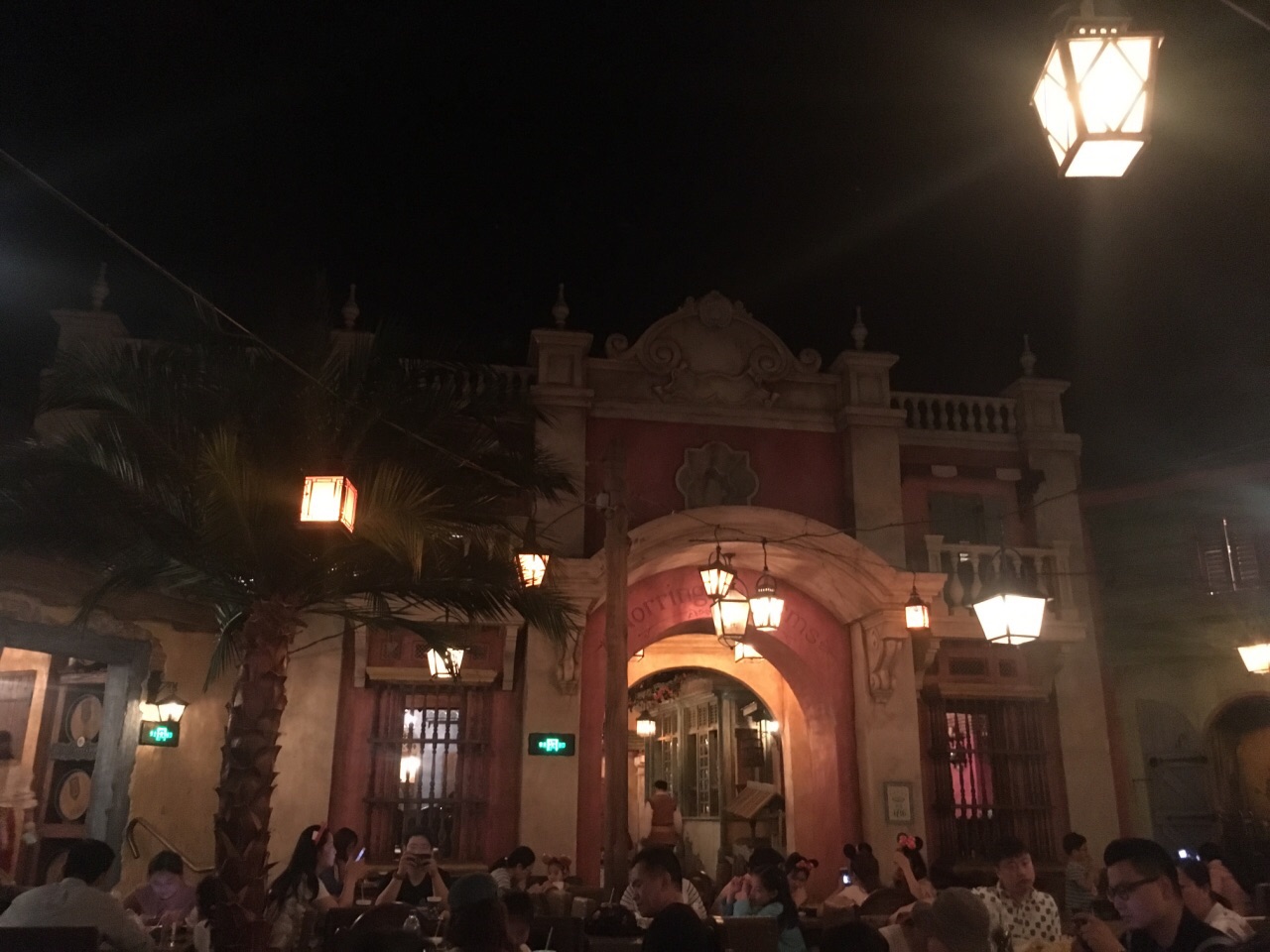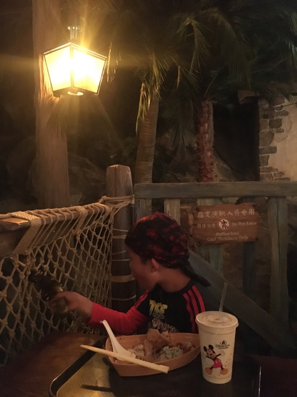 虽然DISNEY玩了近十遍,但园区里的餐厅还一次也没去过.这次正好有季卡优惠,于是带宝宝去了名声在外的"巴波萨"。巴的位置很好找,在海盗剧场旁边,对面就是“海妖复仇号”。一进门就是大厅,里面自选各种套餐,然后在进入用餐区的闸机处买单,然后就可以进入用餐区。餐厅很大,被分隔成一间间独立的小厅,装修是浓浓海盗风,放着小酒馆的音乐,忽明忽暗的灯光营造出神秘的气氛。最喜欢的是靠河的座位,坐在那里可以一边吃饭,一边看一船船游客杀入海盗湾。儿子点了鱿鱼套餐:一整个鱿鱼+洒芝麻的米饭+冰红茶,用30元券后花了45元,个人认为性价比还能接受。虽然味道一般,鱿鱼有点老,但饿坏了的儿子还是吃得津津有味。而且在这里吃饭更主要是体验这种气氛。中午好象还能遇到JACK船长和女海盗,但我们去的时间太晚了,没看到。