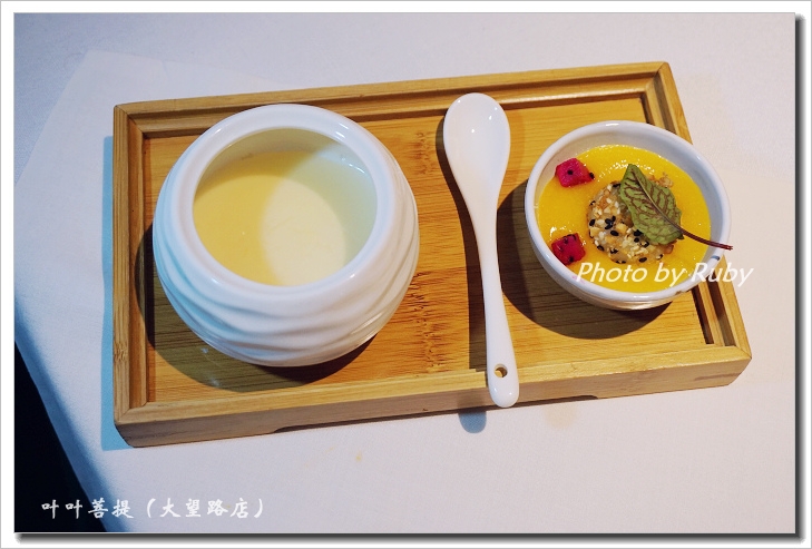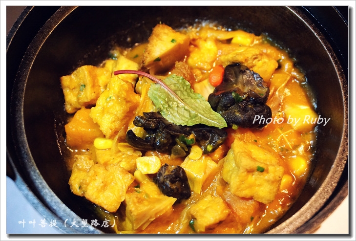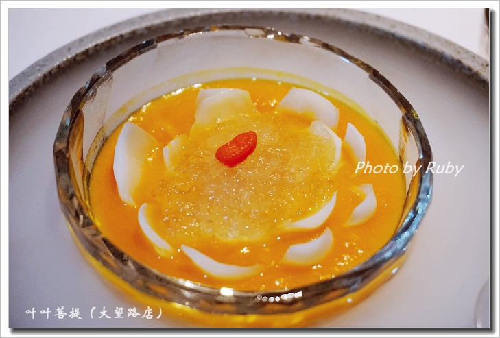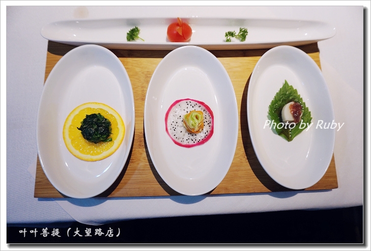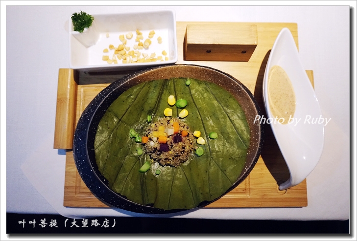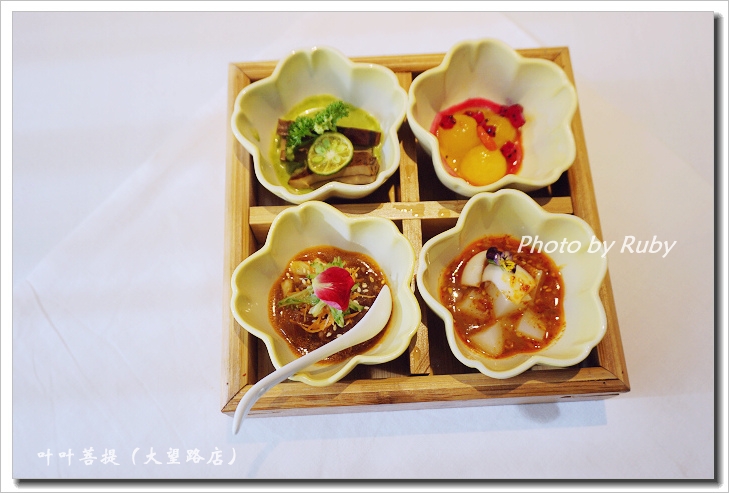 餐厅在大望路阳光100大厦东边的一角,门脸是古色古香带着年代感的木框砖瓦式建筑,好像自成一体的世外桃源,与现代商厦的反差极大。在走进大门的那刻,仿佛进入了另一个世界,金黄色温暖的银杏树叶充满了整个入口,餐厅好像在三层,楼梯间烛光闪闪,一路浓浓的艾草熏香,每一层楼梯间都是不同的,但不变的是佛心禅意。就是楼梯有些高,又没有电梯,已经80+的老爹爬的有些辛苦。店内装修的好像真的佛寺又或是古时深林中出世的小院,瓦房、枯树、莲花灯,曲径通幽,走进店里的那一刻,人的心被即刻安抚,马上变的平静了。着布衣的服务生带我们走到一间大的房间,房间布置的好像禅房一样,有种神秘感,房间两边是用纱帘隔的四人位,我们坐的是其中的一桌,环境独立又私密。 吃的方面,是吃的菩提之语的套餐,包括:花开见佛,是养生汤,配南瓜子和醋泡黑豆;因果自在,是餐前的时令水果;回味无穷,是四款酸甜香辣的开胃小菜,包括:酸菜鱼鱼、橙汁冬瓜、西兰花汁五香卤豆腐、辣汁凉粉;凌波仙子,男士是紫气东来,松茸配各种粗粮,女士是百合金瓜燕;佰财纳福,是罗汉菜;莲心浸浸,是四款美美的蔬菜,包括:拌菠菜、拌西葫芦丝、玫瑰山药、兔子造型的圣女果;欢喜慈悲,是主食,包括:藜麦什锦拌饭、玉米面炒揪片和枣糕;四季回甘,是最后甜品,包括自制酸奶配野生蜂蜜和芒果蓉小汤圆。菜品一道道的上,吃完一道再上下一道,好像吃西餐一样,每道菜都有一个很禅意的名字,虽然是素菜,但并不会觉的乏味,每道菜给我感觉都很新奇,和印象中的素菜很不一样,不是用素的食材做出肉菜的味道,而是健康的、造型美美的、调味高级的,让人已经忘记是在吃素食,就是在尝美食。能够感觉到食材都很有品质,即使很普通的食材,调味也是健康又好味的,对我来讲,这餐下来,没有槽点,真的都是喜欢的。 服务方面,服务生们都穿的布衣,对待客人的态度不急不燥,会耐心解答所有的问题,因为菜品的名字好像都是用佛家用语取的,菜品上桌后,服务生会细致的解释,菜品是什么,在吃饭的同时,还长了不少知识,感觉很好。总的来讲,很喜欢他家,对素食有了新的认识,也很爱他家的环境,在就餐的同时,心理上会变的平静又愉悦,会愿意推荐给朋友,也会再去的。