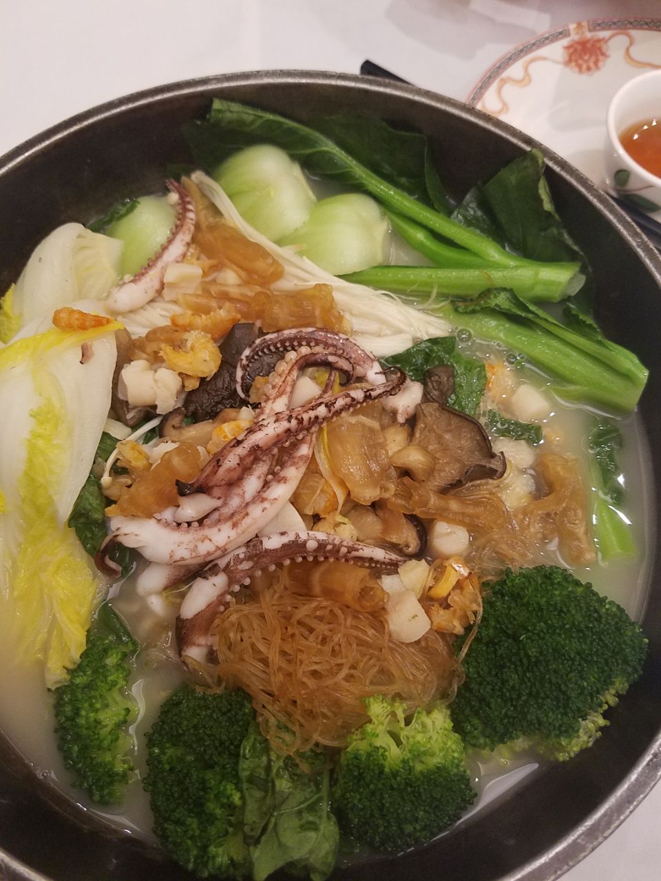 第一次去吃广式的餐厅,还不晓得每个人要收茶位费,这家是每人茶位费最低6元。我们就要了最便宜的茶。晚上喝茶睡不着觉,不懂为什么晚上还要收茶位费。点了三个菜,萝卜糕软糯,什菜煲量大,味道鲜。还有个沸腾蛏子,像冒菜,味道可以,蛏子鲜嫩,有点成都冒菜的味道。服务态度也比较好,上菜比较快。