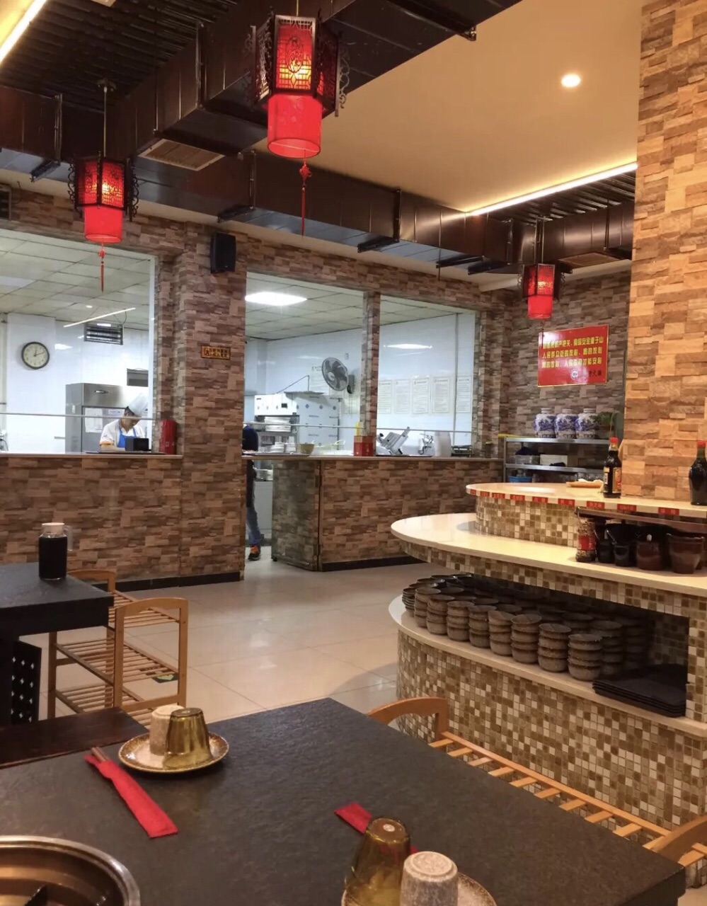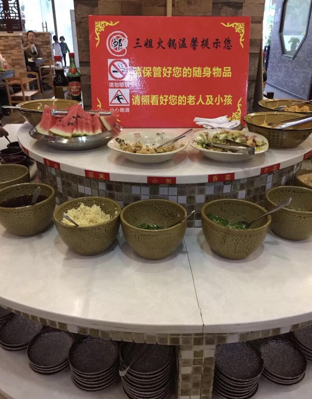 自助小料台,除了各种调味品,还有水果、拌菜和小食等。鸳鸯锅比较好,可以将菜放在不辣的那部分涮,免得香油料都解不了辣。火锅味道还好吧,但是感觉不出还差点儿什么,味道欠点儿,肉品一般,鲜毛肚和麻辣嫩牛肉吃着还可以......