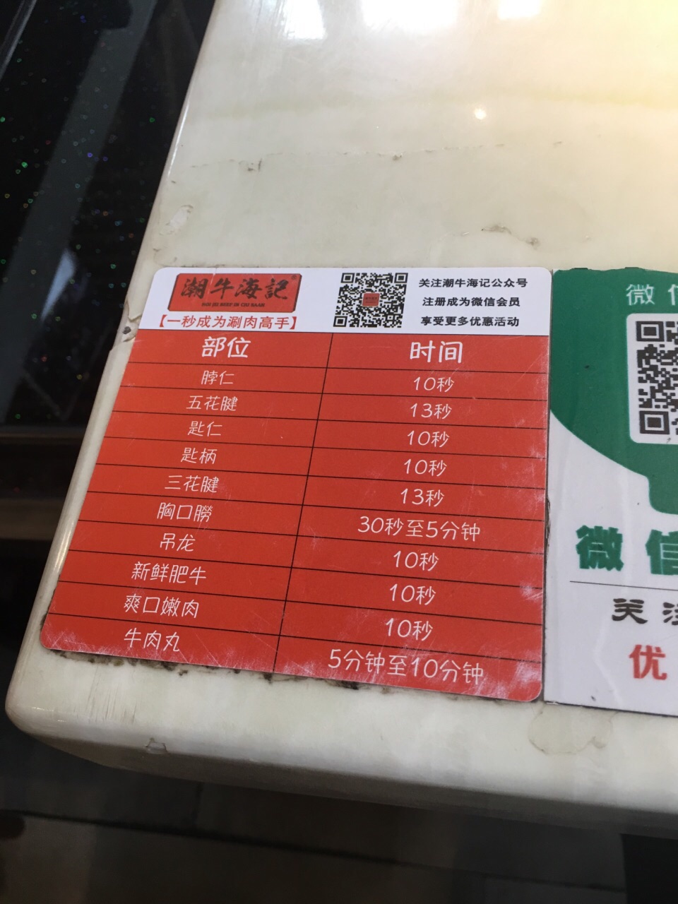 潮汕牛肉火锅,价格不贵,上菜快,就是锅底上得慢些,牛肉串不好吃,烤得太干,粉又太多,已经有焦黑味,牛肉串要3串起点。 锅底点了牛杂锅 想吃五花腱和脖仁下单已经没了,改点了三花腱烫13秒,匙仁烫10秒,爽口嫩肉烫10秒,肉还行。手打牛筋丸,潮汕炸腐皮,调料每位6元。