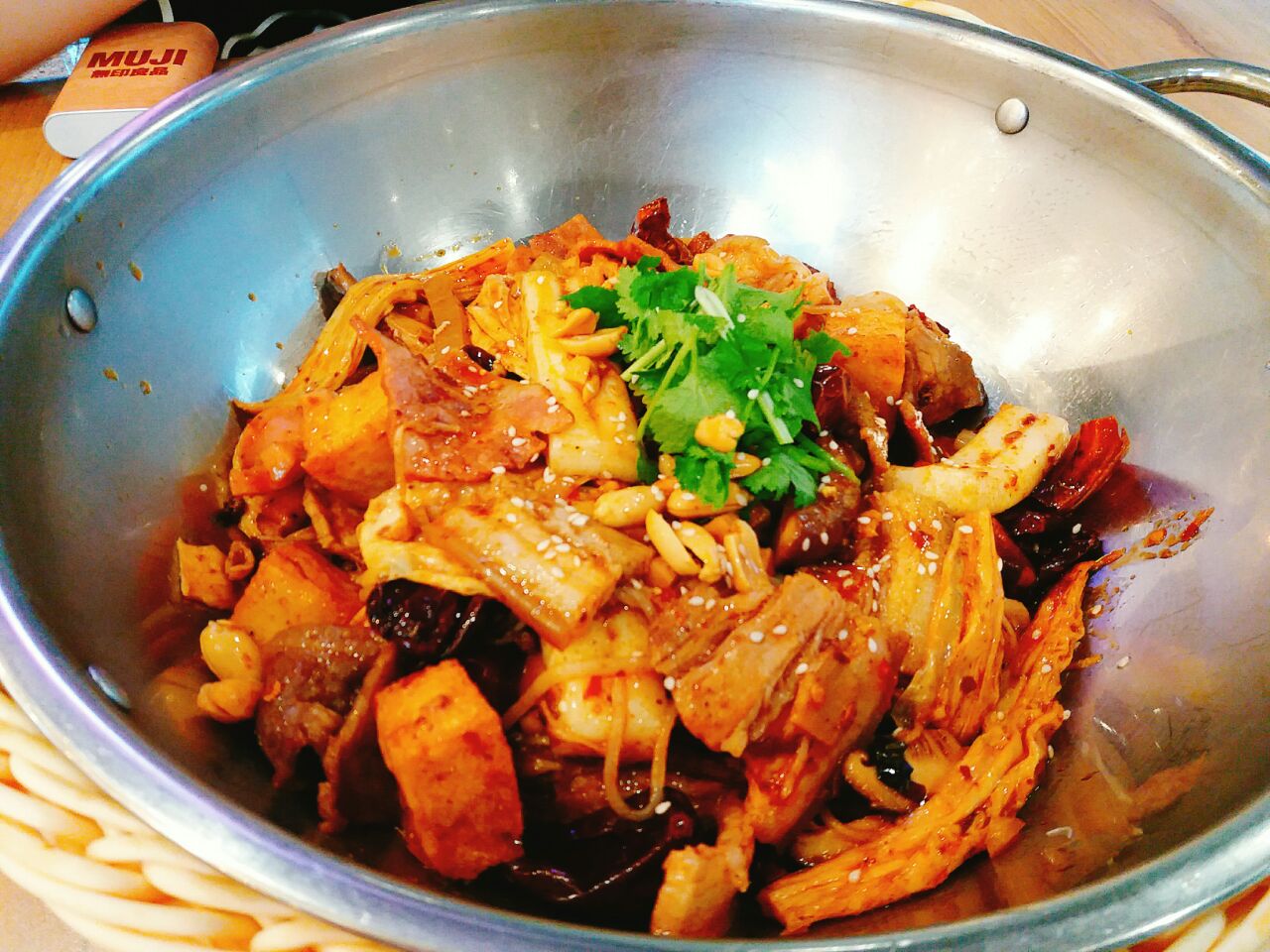 在浦东机场进出口的地方。人挺多,生意也不错。 选择的东西很多,很不错。菜品一共分3类,价格也是不同的。食材看上去就很新鲜,味道也的确不错,点了微辣。 腐竹和魔芋丝都非常好吃,应该多拿点,也不贵。 五花肉炒完也很棒。鸡翅很赞,就是炒在一起后要小心碎骨头。