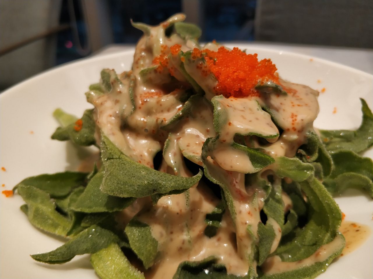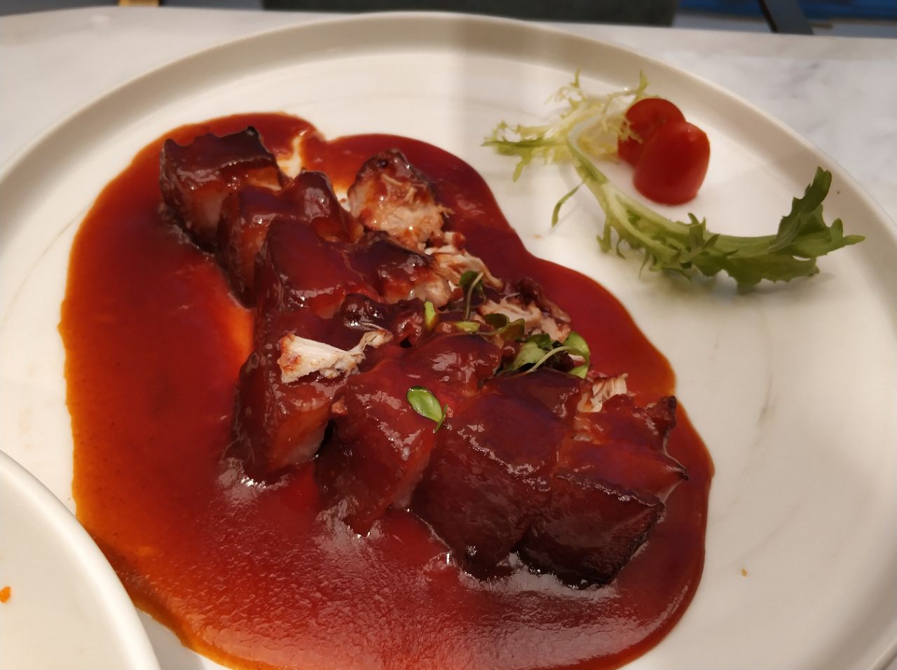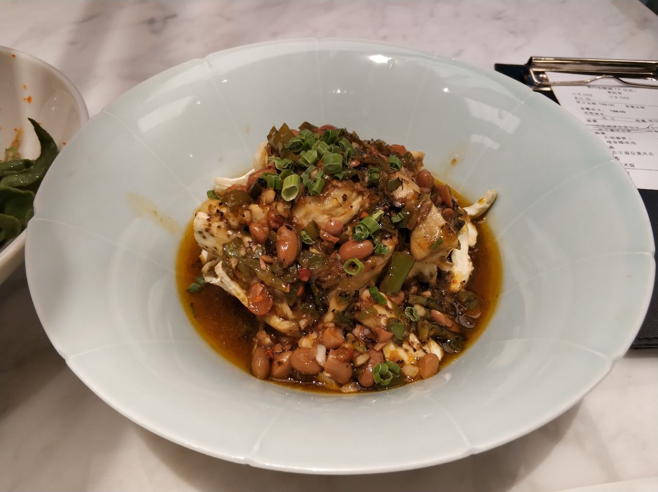 柴门头啖汤,听上去很有历史文化的感觉。加上开在仁恒置地广场,打着汤的旗号,很容易让人误解为高端粤菜。但实际上他家是川菜,而且是不贵的。 一进店门,扑面而来一股轻奢风,装修考究。店面在三楼,临街的座位视野还不错。 等到坐下,拿到菜单一看,也就是中档餐厅的价格。而且还有点评100减50团购券(虽然后来没抢上吧),一顿饭下来,真心不贵。 然而跟装修硬件相比,服务软件差太多了。进门之后,门口一大堆服务人员,就是没人理你。好容易有个人招呼你坐下了,半天没人过来给菜单。最不能容忍的,我点了个眉豆凤爪汤,迟迟不上,临到我都快吃完了,才告诉我没了!早干嘛去了?我到你家也冲的是你家的汤,吃清淡些,你家这管理成大问题了! 正经说菜,汤是最后换的川贝雪梨,其实是水果肉汤,看得出煲了一定时候了。不过手艺待提高,汤里的瘦肉极柴。标榜头啖汤,但备货不足,晚餐刚一开始就没有招牌了,煲汤水平有待提升。 评价榜头名的樱桃肉,我认为是胜在性价比了。其实就是樱桃肉,有些肥而不腻,瘦而不柴的感觉,番茄汁调的也不那么冲,所以还行。结合价格,39,那么一大块儿肉,,, 鱼子酱拌冰草,是缩写,全称是鱼子、酱、拌、冰草。酱是芝麻酱,不是你们想象的那种用鱼子酱拌的冰草。有点儿鱼翅炒饭的遗风。不过味道还行。 还点了水豆豉拌茄子,谁让咱是看见水豆豉就走不动路星人呢?我发现我对水豆豉,芝麻菜,芦蒿这样有异味儿的菜都情有独钟,不知道为啥。不过他家的水豆豉不知是煮过还是什么原因,不好吃,太咸。