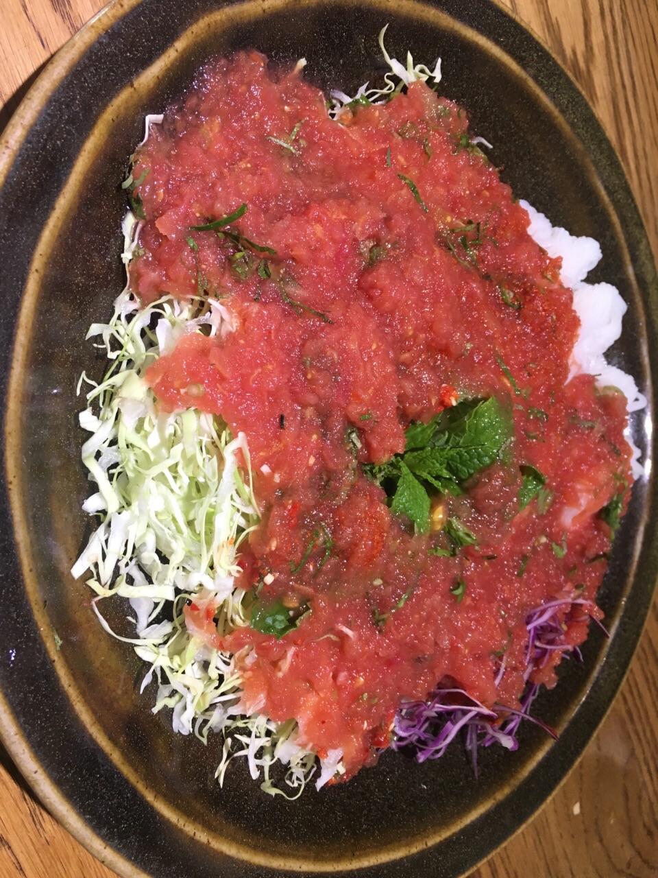 位于三里屯使馆区,门口可以停车。餐前送的膨化小食品非常好吃。点了菠萝饭,口味特别赞,果肉很甜,米饭香糯。汽锅鸡一大盆,喝汤不错,味道一般,感觉女生要四人吃。还有浇番茄酱的凉菜,红红一盘,很是解腻。人均100左右。中午人多,上菜太慢。
