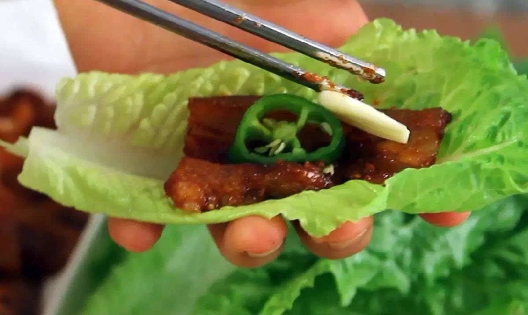韩国烤肉吃法有别于中式烤肉和巴西烤肉,其吃法很特别,吃肉的时候要包着生菜叶或苏子叶吃。学校附近呢